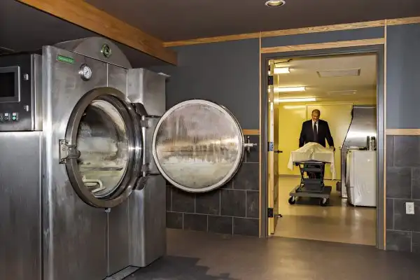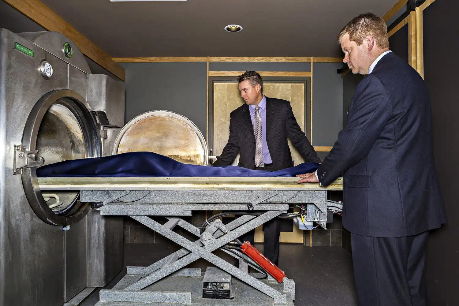 Джейсон Брэдшоу и сотрудник бюро Кэмерон Блэк помещают тело в резоматор.