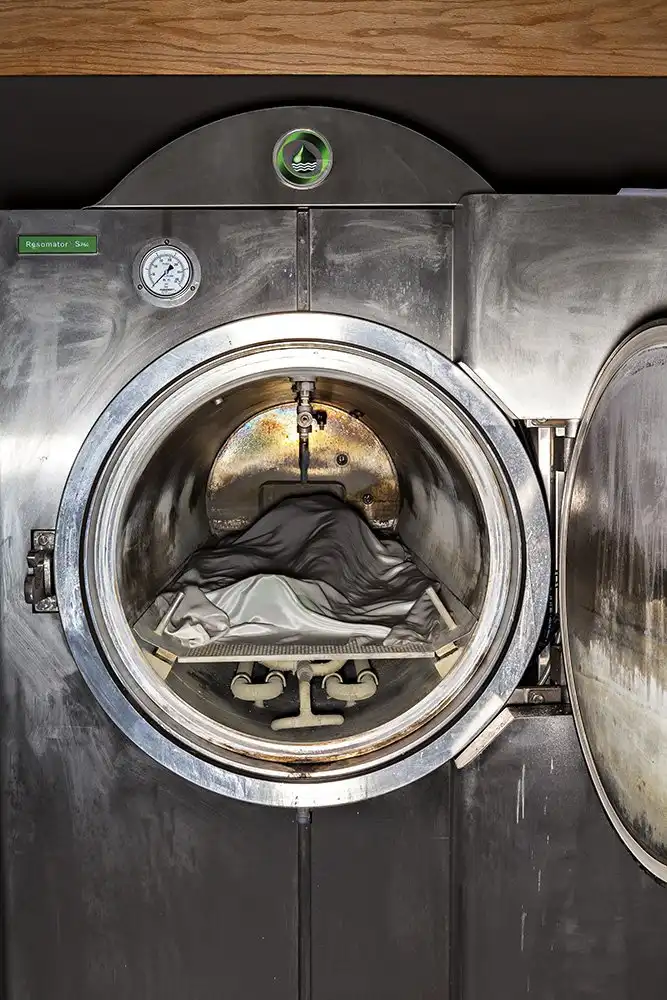 Мёртвое тело, готовое к кремации, только что было помещено в экологически чистый резоматор (resomator). Эта камера из нержавеющей стали, принадлежащая Бюро похоронных и кремационных услуг Брэдшоу (Bradshaw), использует вместо пламени смесь воды и гидроксида калия, чтобы расщеплять тела на пептиды, мыла, соли и сахарозу.