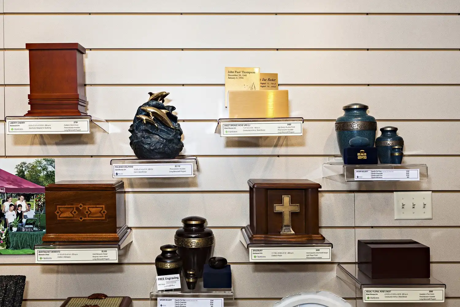 Различные урны, выставленные на продажу в крематории Брэдшоу.