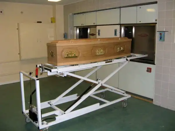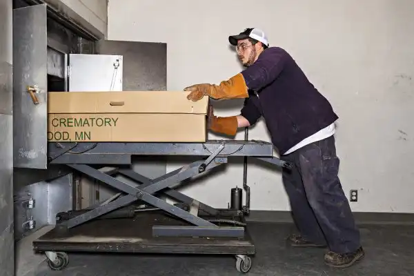 Рой Куинн (Roy Quinn), оператор крематория при Форест-Лонском Мемориале (Forest Lawn Memorial), помещает тело в кремационную печь.