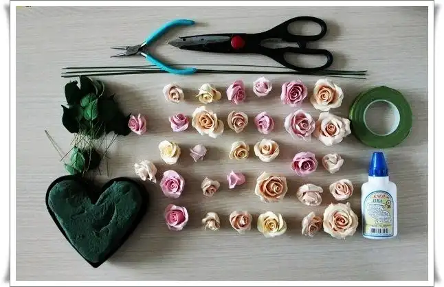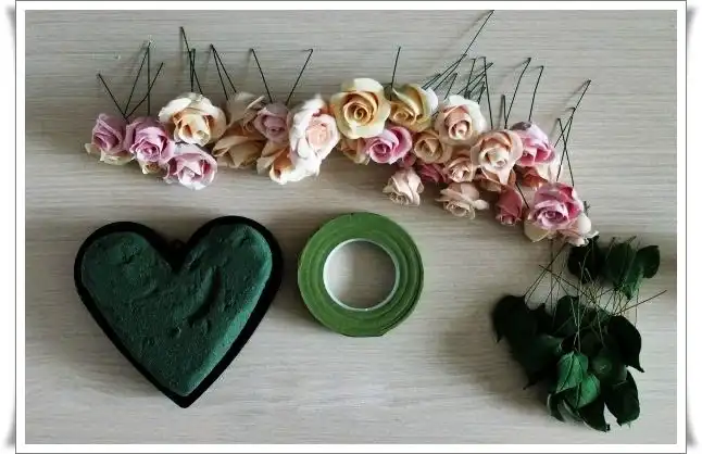 Чтобы сделать сердце из роз, вам понадобится основа для него — флористический оазис (флористическая пена, флористическая губка). В магазинах, торгующих товарами для флористики, продаются флористические губки, уже вырезанные в форме сердца. Они могут быть цельными или с открытой серединой. Если вы планируете сердцем из роз украсить капот автомобиля, нужно взять оазис с магнитным или клейким основанием.