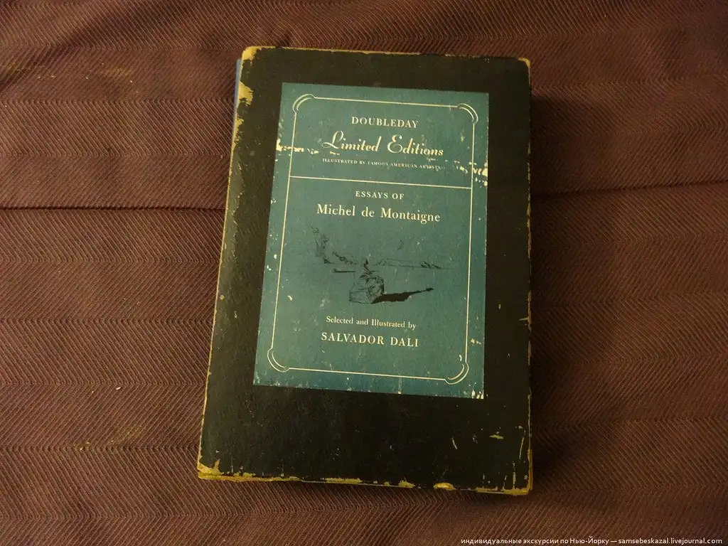 Набрав коробку книг и разной фигни он идет домой, где начинает внимательно изучать найденное. Среди кучи книг находится одна, на обложке которой написано: Мишель де Монтень, Эссе. Специальное издание, 1947 год. Иллюстрации "известного американского художника" Сальвадора Дали.