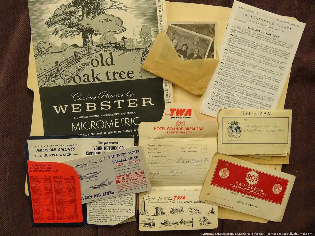 Исторические артефакты. Слева направо, сверху вниз: нулевая папка с копиркой, старые фото, отчет разведки для ООН, авиабилеты Western Air Lines, бланк уведомления из отеля во Франции с рекламой TWA, конверт с телеграммами (большинство отправлено с Кипра), радиограмма RCA.