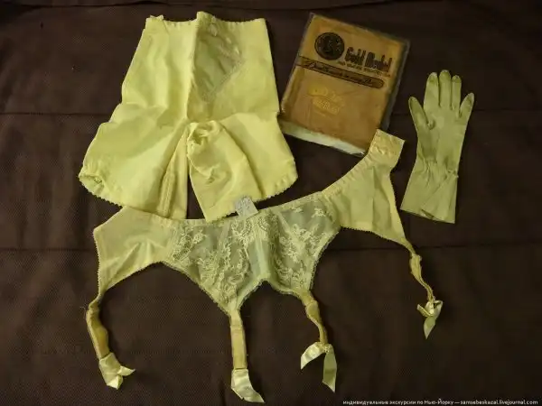 Из найденного. Женское нижнее белье. Новое с бирками. Чулки в упаковке и даже не распечатаны. Год определить затрудняюсь, но большинство того, что мы откопали было из периода между сороковыми и шестидесятыми.