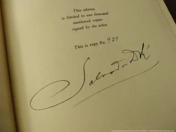 На первой странице обнаруживается надпись: это издание ограничено тиражом 1000 экземпляров и подписано художником. Это копия номер 950. А под этим оригинальная подпись самого Дали, сделанная перьевой ручкой.