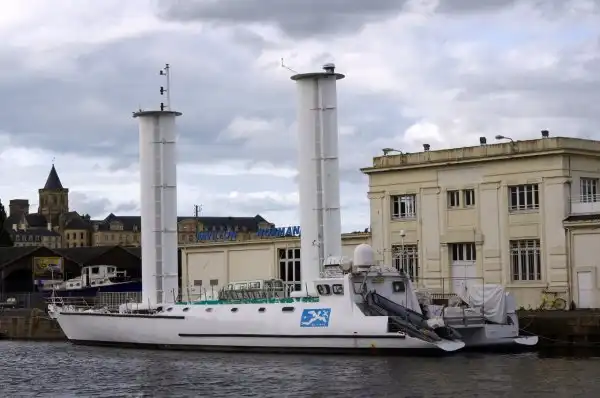 А в апреле 1985 года в порту Ла-Рошель была спущена на воду «Алкиона» — первый полноценный корабль, оборудованный турбопарусами. Сейчас она по-прежнему на ходу и на сегодняшний день является флагманом (и, по сути, единственным крупным кораблем) флотилии команды Кусто. Турбопаруса на ней служат не единственным движителем, но помогают обычной сцепке из двух дизелей и