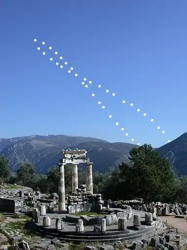 Эта фотография была сделана в Греции (то есть в северном полушарии). Значит, самая низкая часть аналеммы фотографировалась в конце декабря, а самая высокая – в июне.