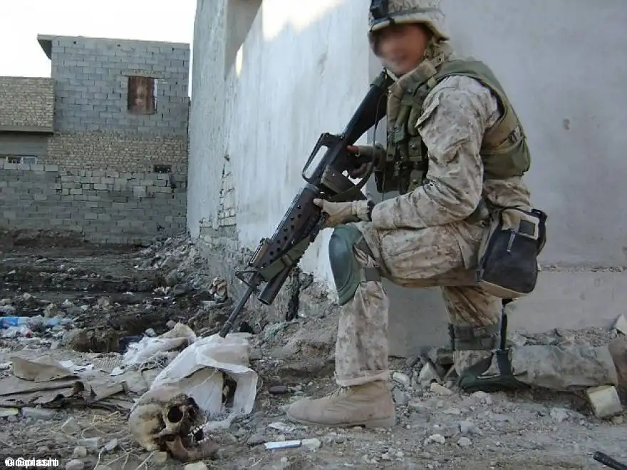 На других ужасных снимках американский солдат позирует на камеру, сидя на корточках рядом с черепом, обыскивает карманы погибшего иракского военного, широко улыбается и наводит прицел автомата на скелет.