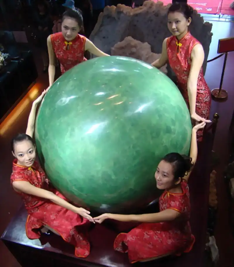 Глыба флюорита в форме сферы была найдена несколько лет назад во Внутренней Монголии на севере Китая. Минерал обладает свойством светиться в темноте при нагревании. Специалистам понадобилось около трех лет, чтобы придать глыбе правильную круглую форму и превратить ее в каменную «жемчужину» диаметром 1,6 метра. После того, как работы были завершены, изделие было решено выставить во дворце драгоценностей.