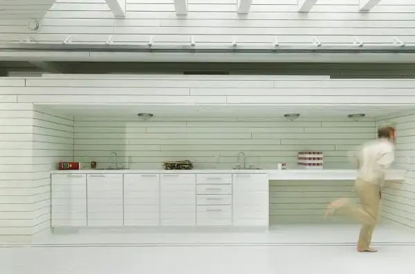 Цветовое решение студии решено за счет двух контрастных цветов: белые интерьеры и черные фасады здания.