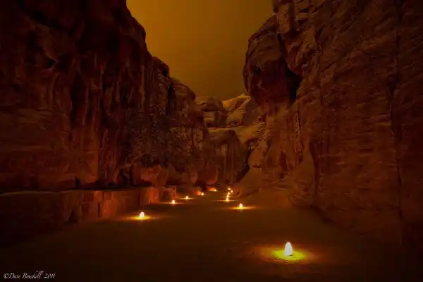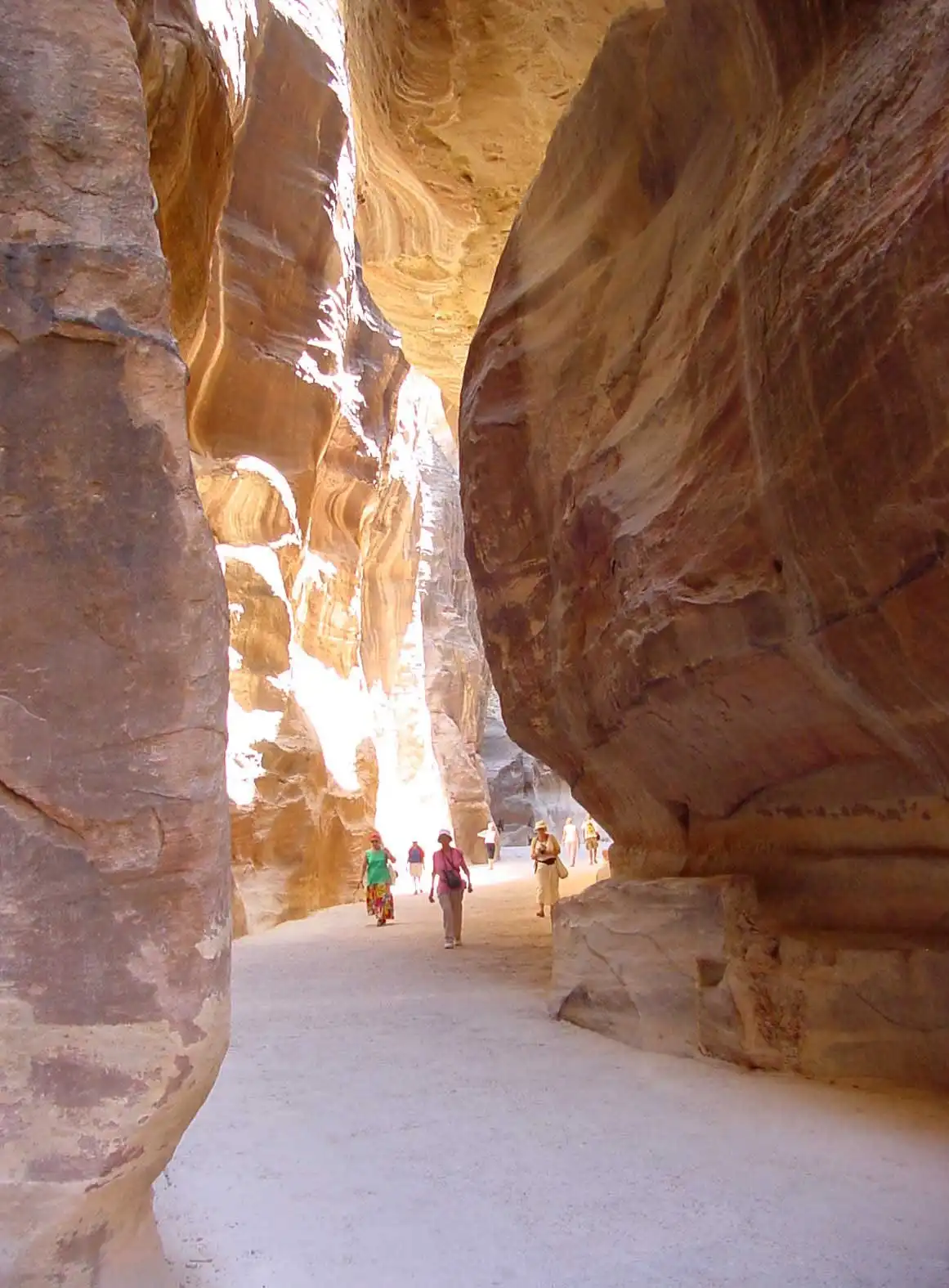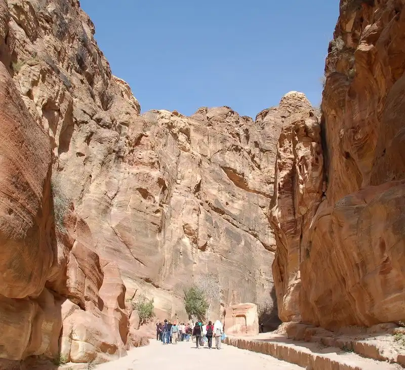 К городу ведет «тайный путь» — ущелье Сик. Проход через Сик, который мы совершили рано утром, стал для нашей туристической группы одним из самых сильных переживаний. Узкий, не более пяти метров шириной, извилистый, длиной около полутора километров проход с двух сторон закрывают отвесные скалы песчаника, удивительных розовых оттенков, подсвеченные утренними лучами Солнца, достигающие 90 метров в высоту. Стены Сика испещрены письменами — здесь можно увидеть надписи на всех Древних языках Старого Света. Их оставляли купцы, посещавшие Петру в пору ее расцвета.