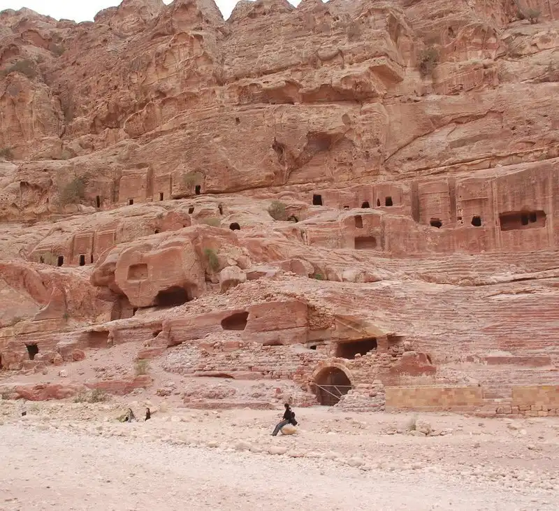 Несмотря на то, что, прежде всего Петра — это город-некрополь, в лучшие времена здесь жили, по крайней мере, 20 000 человек. Просто дома, расположенные на равнине, не сохранились до наших дней. Зато до нас дошли постройки римских времен, говорящие о том, что некогда жизнь в Петре била ключом. Это и центральная мощеная улица, колонны, триумфальная арка, руины некоторых других сооружений. Великолепный театр на три тысячи человек к этому ряду не относится, поскольку он был возведен задолго до прихода римлян и, по всей видимости, использовался набатеями в ритуальных и религиозных целях. Сказать точно, что происходило на сцене это театра, невозможно. Как уже говорилось, письменных свидетельств не осталось, так что остается только строить всевозможные догадки. По этой же причине не следует удивляться некоторым загадочным названиям в Петре: Храм крылатых львов, Дворец дочери фараона, Джинновы глыбы, Казна фараона. Все они были придуманы намного позже, когда от набатеев не осталось и следа. Те, кто давал подобные названия, руководствовался при этом не надежными источниками, а своими собственными весьма субъективными впечатлениями.