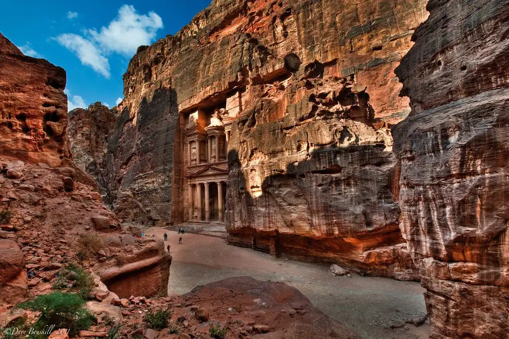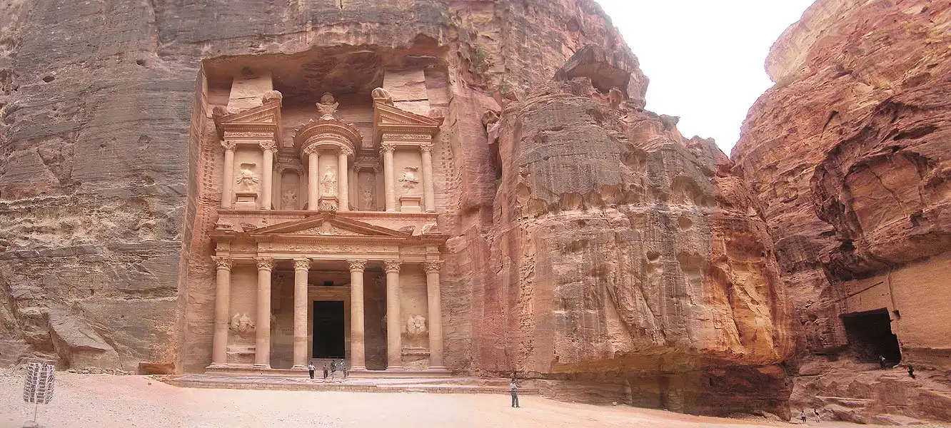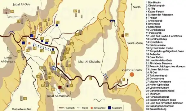 Для того чтобы добраться до города, туристы идут пешком или едут на повозках с лошадьми через «Сик» — внушительный разлом в Нубийском песчанике. Это извилистый излом, длиной в один километр, среди нависающих отвесных скал. Последний поворот — и из мрака возникает величественная Петра и первый на пути монумент Эль Казнех — Сокровищница, вырезанная из скал. За Эль Казнех возникают высеченные из скал и построенные здания, будто парящие храмы, римский театр на 3000 человек, небольшие дома, усыпальницы, каналы и резервуары, бани, рынки, арочные ворота, улочки.