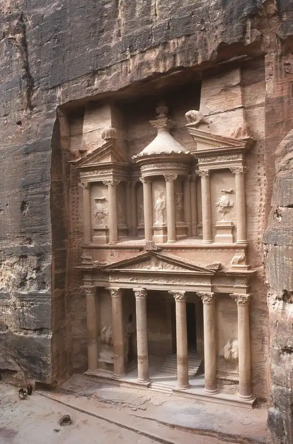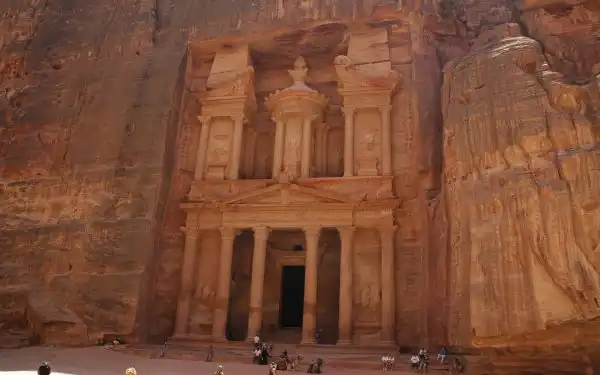 Снизу видна лишь узенькая полоска неба. Гид не предвосхищает событий, держа в тайне момент появления Петры. И в конце ущелья мы оказываемся захваченными небывалым зрелищем – взору открывается главный памятник Петры, Казнат эль Фарун –«Сокровищница Фараона». Это один из ярчайших примеров набатейского искусства резьбы по камню. Богато украшенный резными изображениями, сорокаметровый фасад увенчан огромной урной — древним символом богатства.