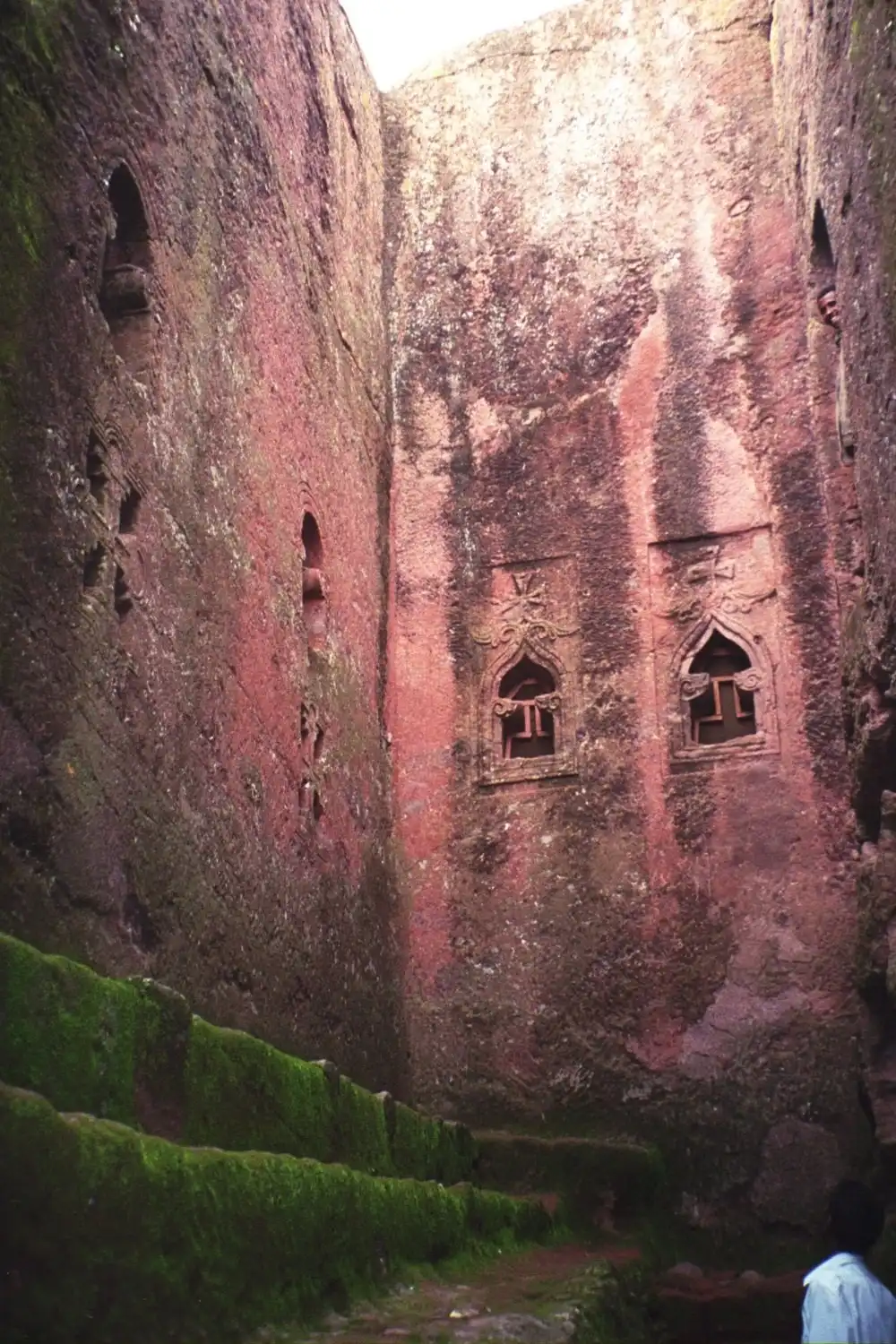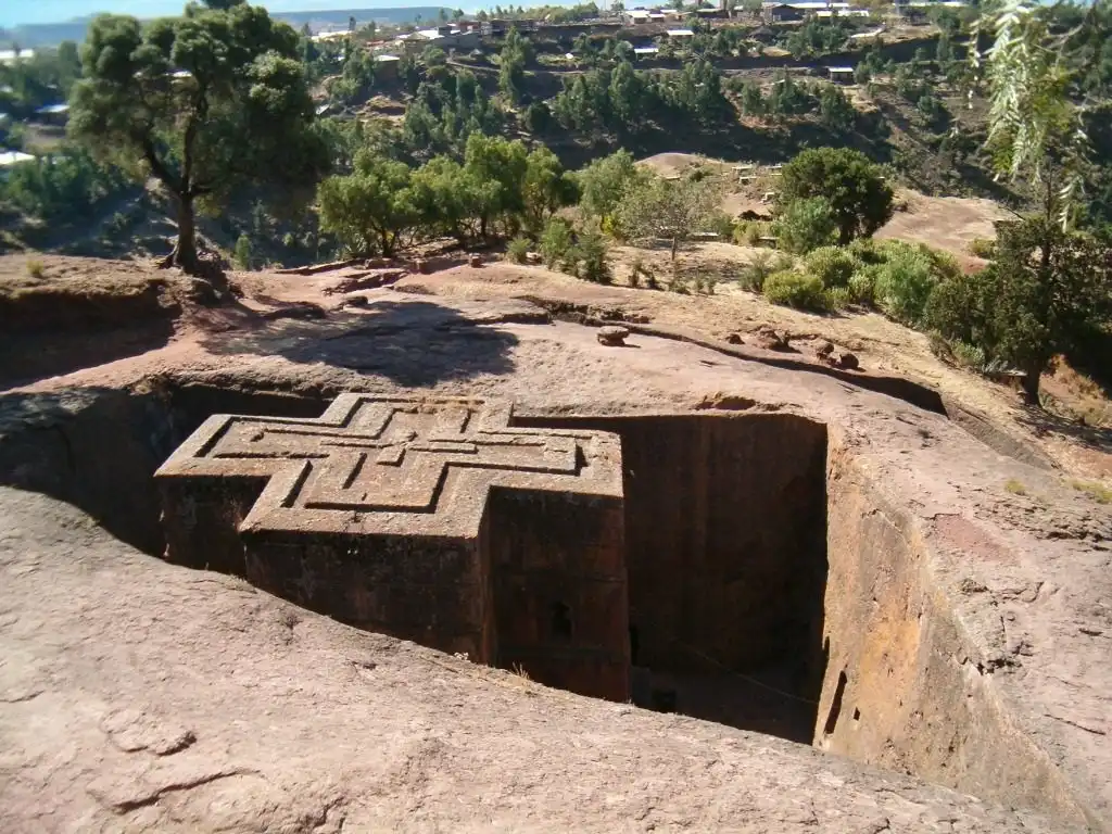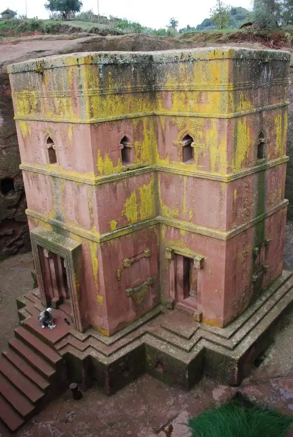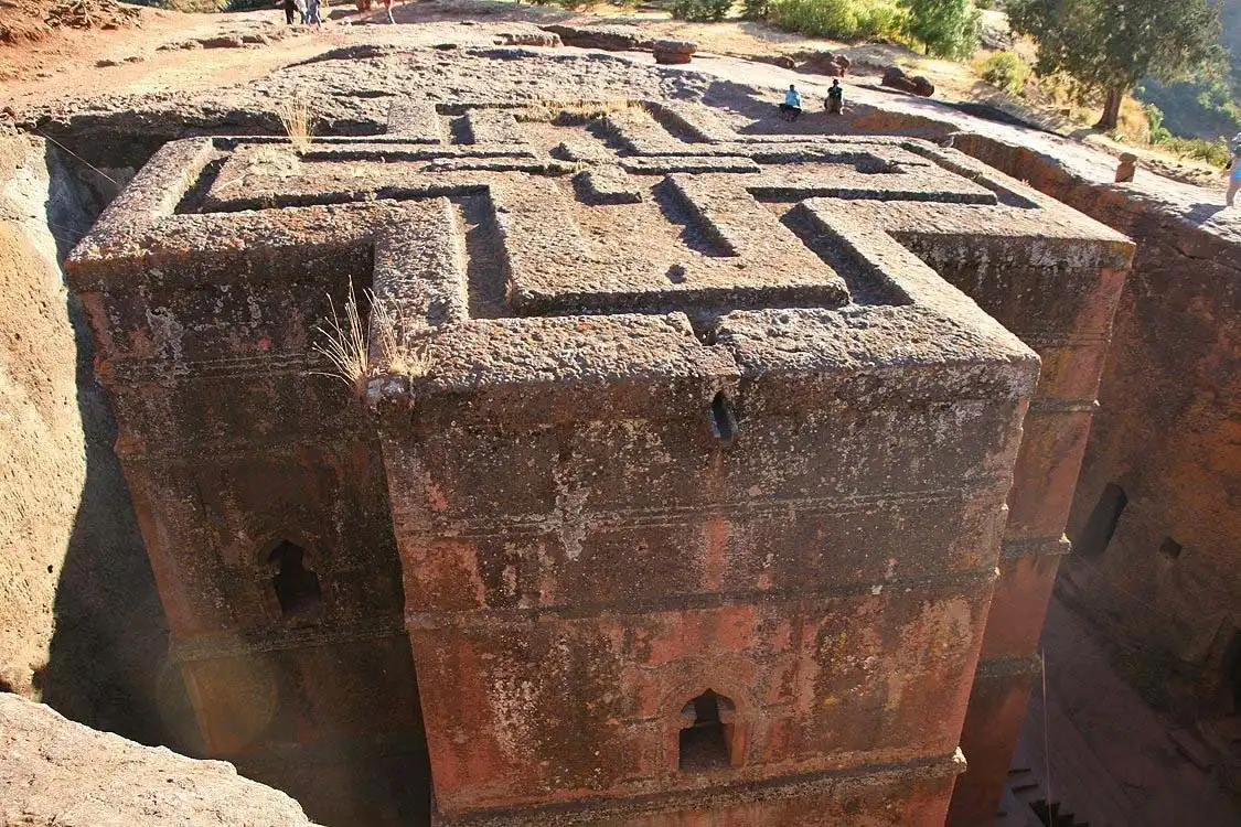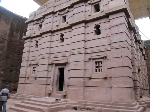 По легенде, когда король Лалибела уже заканчивал строительство скальных храмов, к нему явился неожиданный гость. Это был Святой покровитель Эфиопии Георгий Победоносец во всеоружии на белом коне. И тогда король решил посвятить ему самый красивый храм своего города. Бета Гиоргис часто по праву называют Восьмым чудом света. Чтобы спуститься к входу храма Святого Георгия, нужно пробраться по проделанному в скале узкому проходу, в котором иногда и двоим-то трудно бывает разойтись. Храм Святого Георгия уникален тем, что у него нет ни одной колонны. Все остальные храмы Лалибелы имеют внутренние или внешние колонны.