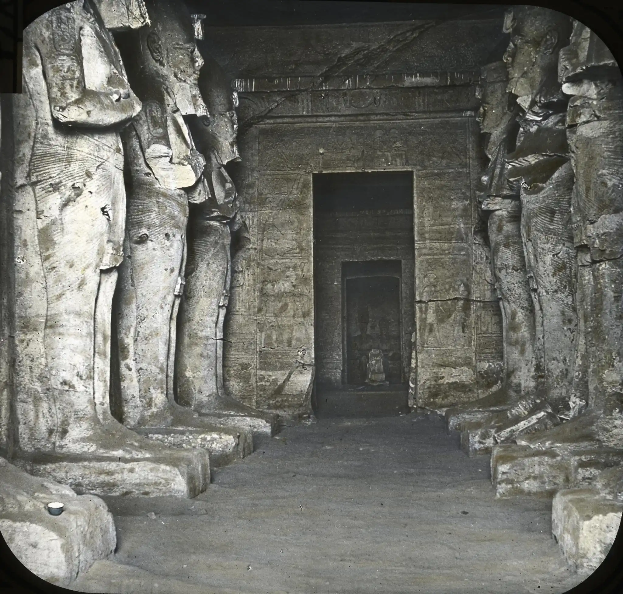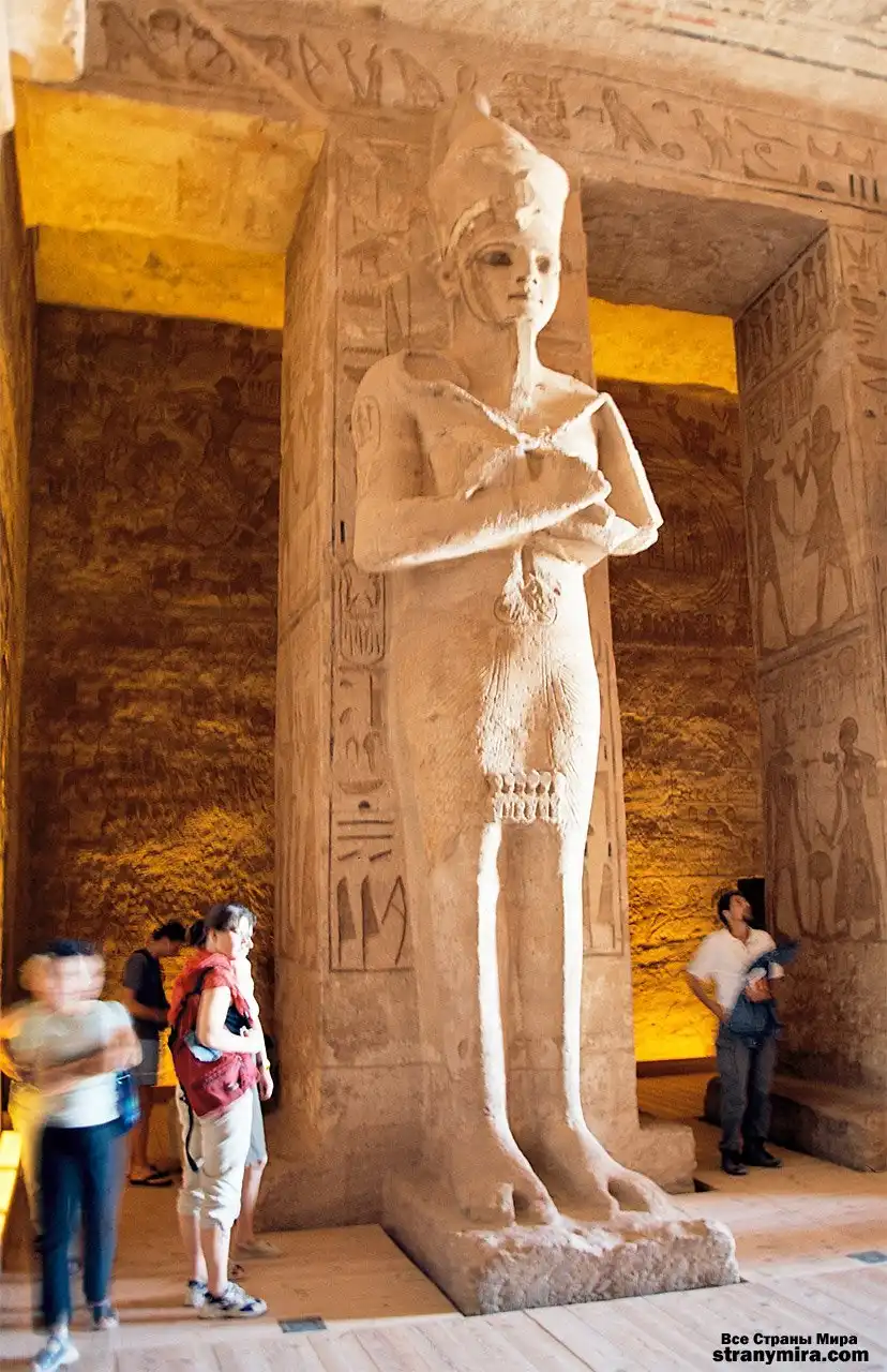 Образ великого фараона господствует в храме Абу-Симбел. Сразу же за дверями, в первом помещении храма, посетителя встречают восемь фигур фараона Рамсеса в облике бога Осириса. Они стоят по четыре с каждой стороны. Стены и потолки внутренних помещений храма покрывают росписи и раскрашенные рельефы, относящиеся к лучшим образцам искусства Древнего Египта позднего периода.