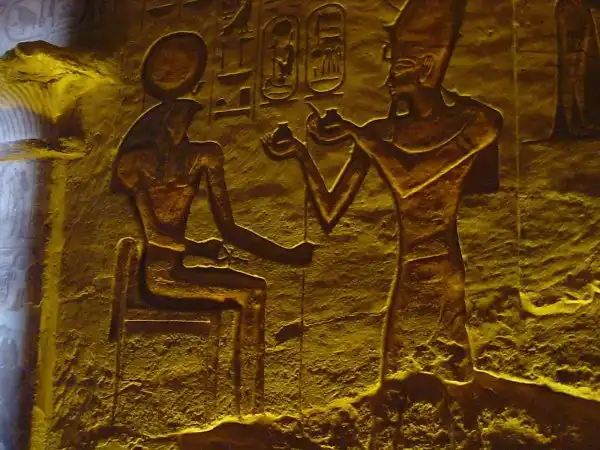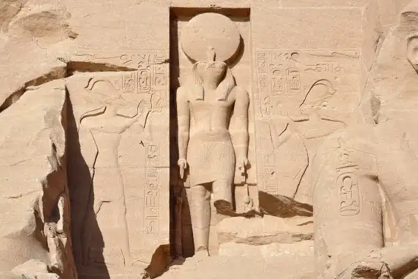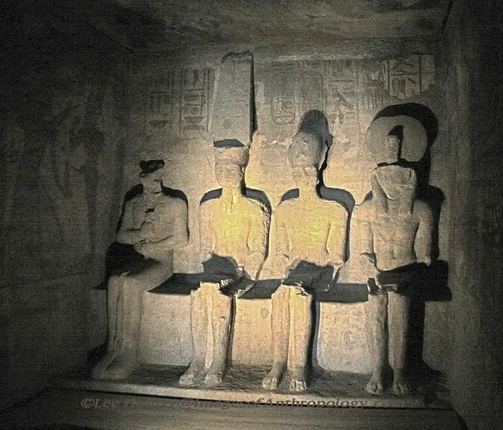 Вход в Большой храм Абу-Симбела ориентирован на восток. Первые лучи солнца, освещая фасад, проникают во внутреннее пространство – сначала в первый зал, с четырехгранными колоннами-столбами и статуями фараона в образе бога Осириса, затем во второй зал, и далее – в святилище. В его самом дальнем конце располагались статуи богов и фигура фараона Рамсеса II. Два раза в год лучи восходящего солнца падали на статуи Рамсеса, Амона и Ра-Хорахте; четвертая фигура, бога Птаха, не освещалась никогда: Птах – владыка подземного мира, и солнце ему ни к чему, он должен вечно пребывать во тьме.