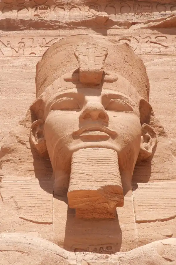 Несмотря на то что Большой храм, помимо обожествленного фараона, был посвящен еще трем богам, вся идея сооружения состояла в возвеличивании Рамсеса II всеми возможными средствами. Это особенно подчеркивает фасад храма, вырубленный в скальном массиве в виде традиционного пилона, только невообразимых размеров, где вход в святилище обрамляют четыре исполинские, двадцатиметровой высоты фигуры Рамсеса II. Эти изображения сидящего фараона портретны! Как мастерам удалось при таких масштабах статуй, высеченных из твердого песчаника, умудриться сохранить портретное сходство? Это же поразительно! И дело не столько в том, насколько похож или не похож изображенный ими фараон на себя – восхищает сама техника изготовления фигур таких масштабов. Ведь изготовить их можно было, только в совершенстве владея системой пропорций, устанавливающей точные соотношения между размерами фигуры и каждой из ее частей.