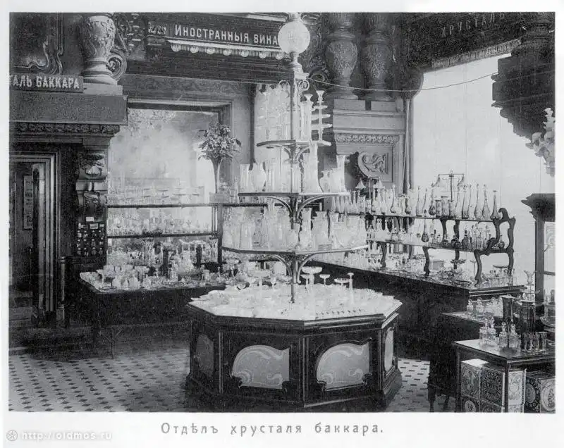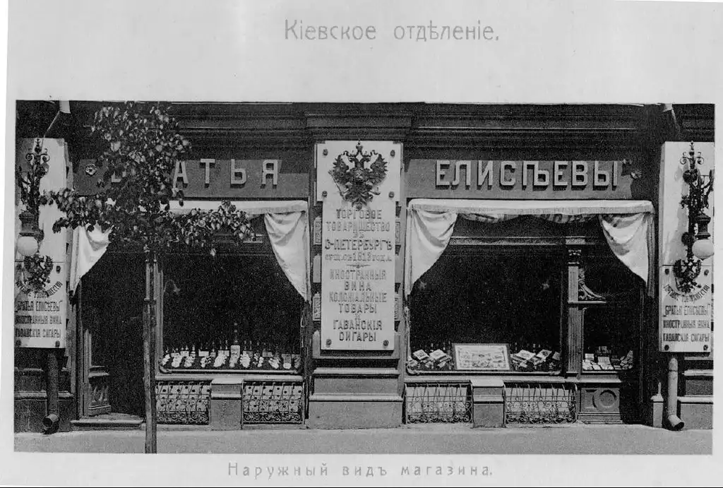 В начале века Г.Г. Елисеев открыл новые шикарные магазины в Петербурге, Москве и Киеве. Для петербургского магазина был специально выстроен в самом центре города, на Невском, напротив памятника Екатерине II, несколько аляповатый дом с огромными фигурами греческих богов — покровителей торговли и ремесел — на фасаде, с роскошным торговым залом и внутри — высотою в два этажа. В глубине зала зеркало во всю стену увеличивало пространство и повторяло художественно разложенные и расставленные на полках и прилавках окорока, колбасы, балыки, по-океански таинственных омаров и крабов, бочонки с черной и красной икрой и знаменитым финским маслом, горы фруктов и кокосовых орехов, поблескивающие в электрическом свете бутылки с яркими этикетками. Это было царство обжорства, гимн богатству. В 6 часов вечера у входа в магазин пушкарь в костюме петровских времен заряжал пушечку, и раздавался выстрел — ежедневный салют дому Елисеевых.