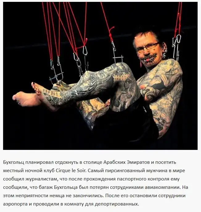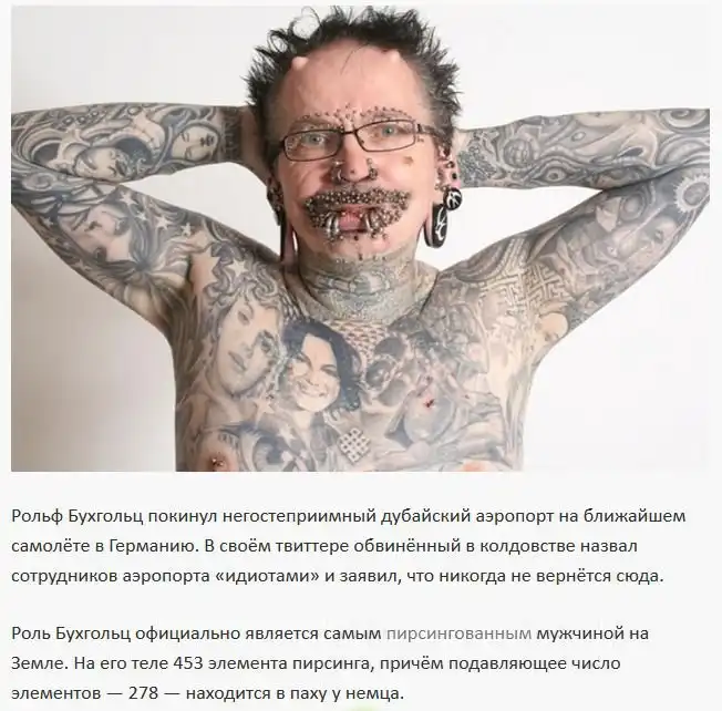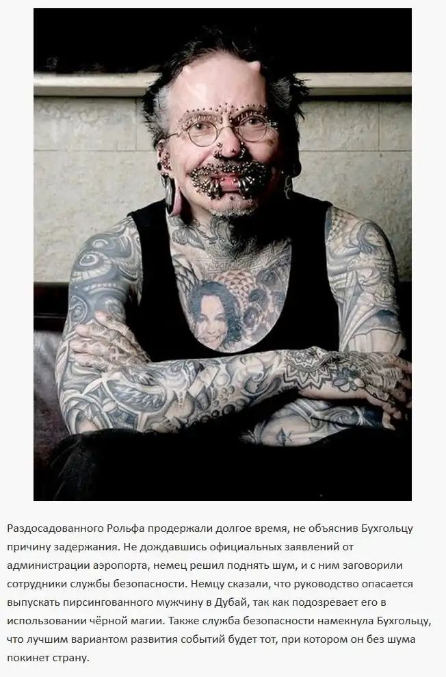 Немец по имени Рольф Бухгольц является рекордсменом книги рекордов Гиннесса по количеству пирсинга в его теле и на данный момент является самым пирсингованным мужчиной в мире. Так вот, не так давно Рольф прилетел в столицу Арабских Эмиратов, но таможенная служба Дубая не позволила немцу даже выйти из аэропорта, вообще запретив ему въезд на территорию Эмиратов. Что самое интересное, такое решение таможенная служба объяснила весьма необычным заявлением о том, что по их версии Рольф Бухгольц, по всей видимости, практикует чёрную магию и колдовство, что запрещено законами ОАЭ.