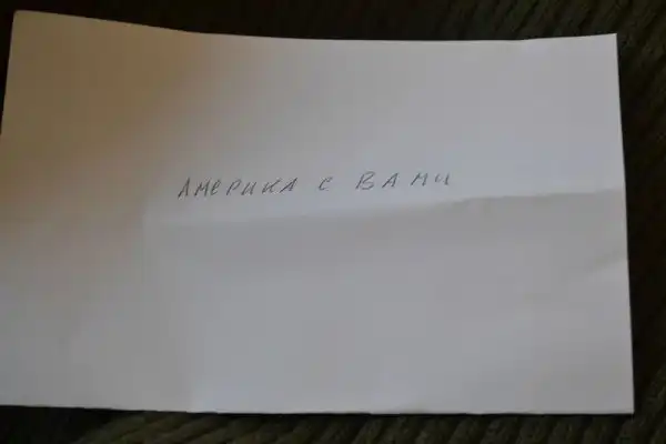 И лист бумаги. На одной стороне слова "Америка с вами!".