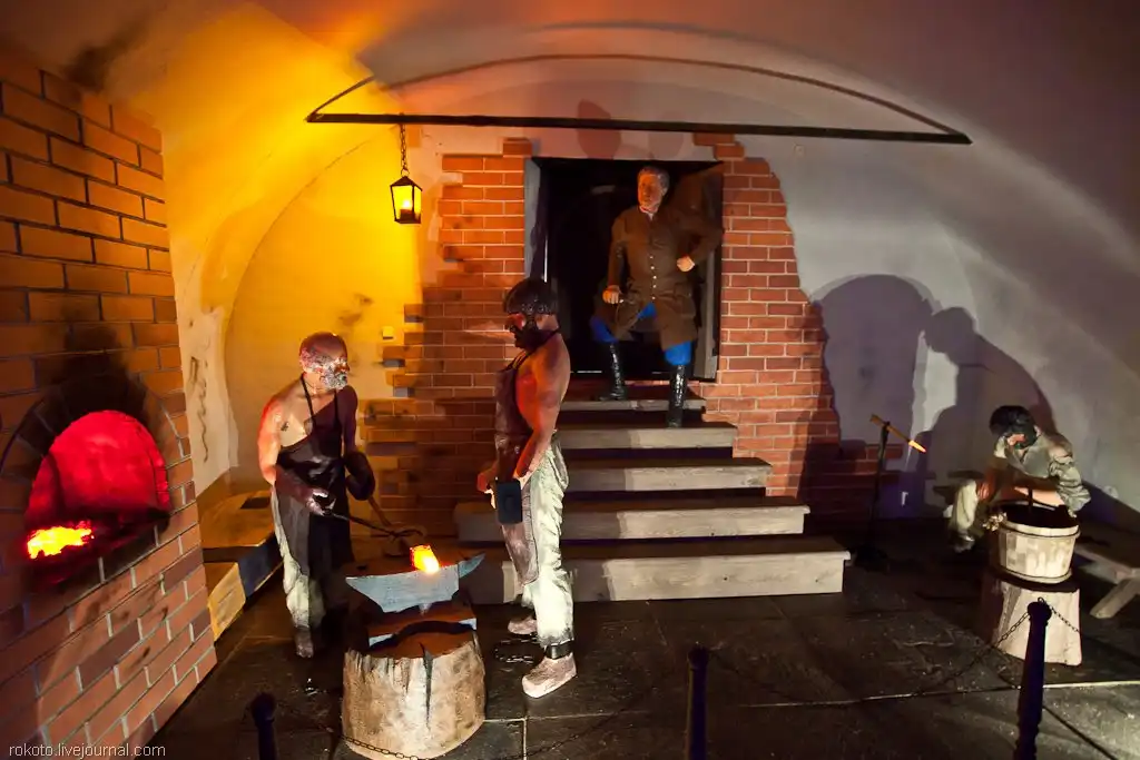 Потом идёт ещё несколько довольно скучных комнат (просто скучных, страшно уже не будет). В одной копия портрета Демидова, в другой можно отчеканить себе монету. Я не буду всё это показывать, т.к. это совершенно стандартная программа для кучи подобных экскурсий и мне это было совершенно не интересно. Вот, лучше посмотрите на схему башни. В одной из комнат выставлено довольно много всяких документов, фотографий и схем, но хорошенько рассмотреть времени вряд ли хватит.