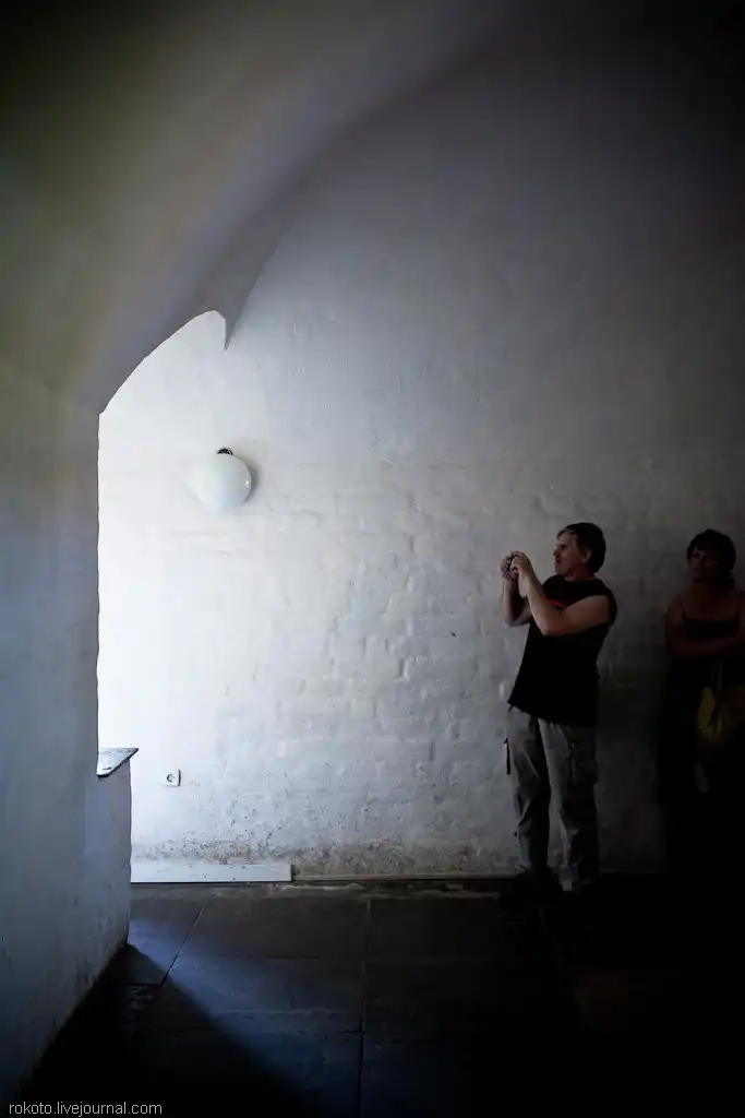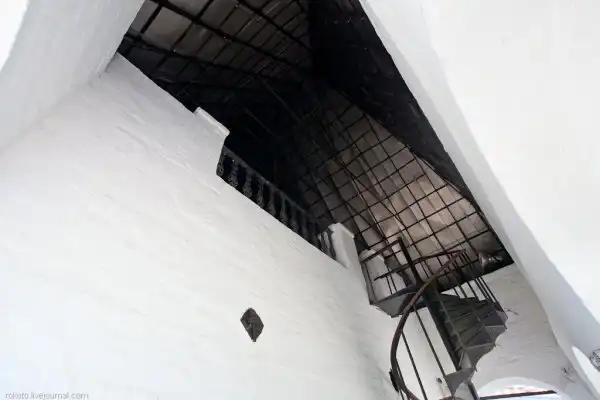 Башня задумывалась ими как административный и производственный комплекс. Высота ее примерно с двадцатиэтажный дом, ведь башня была своего рода сторожевой вышкой. Особо следует отметить комнату на четвертом этаже, называлась она акустической. Если в любом из ее углов вполголоса что-либо скажешь, то слова отчетливо слышались во всех других углах. Но вот если человек стоит за спиной говорящего, он ничего не сможет разобрать — услышит только бормотание.