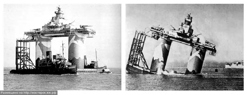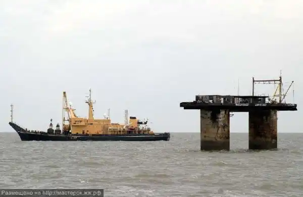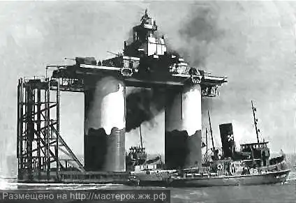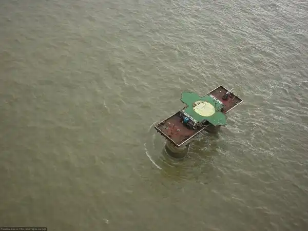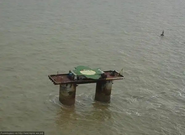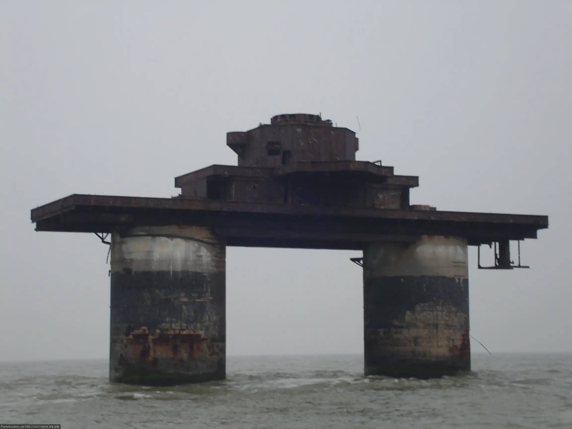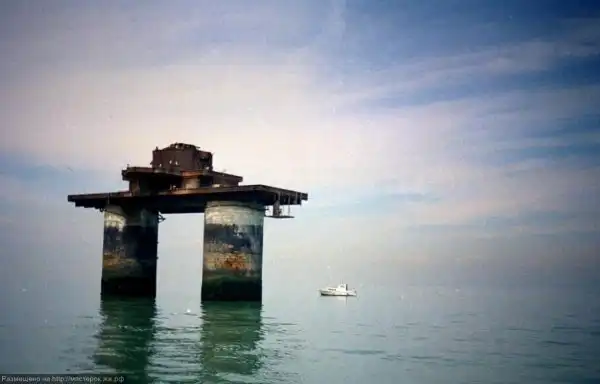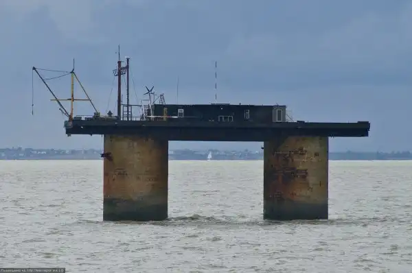 На фотографии форт, который был построен в 1942 г. На нем размещалось артиллерийское орудие и радиолокационное оборудование. Держится на двух полых колоннах.