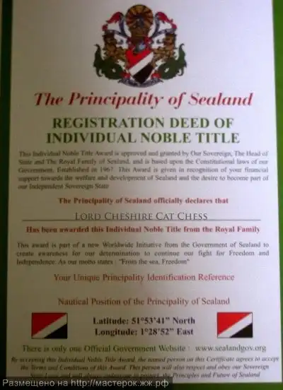 Теперь о юридическом статусе княжества Силенд. Встретив вооруженное сопротивление населения Силенда, представители ВМС Великобритании обратились в суд Эссекса с требованием освободить платформу, незаконно занятую гражданином Англии. Но судья Эссекса принял обратное решение – в начале сентября 1968 года он вынес решение о том, что морская платформа Силенд находится вне юрисдикции Великобритании, т.е. законы страны над ее населением не властны. Это был первый успех молодого княжества, который князь Рой I Бейтс немедленно решил закрепить, выпустив собственные почтовые марки в 1969 году (и потребовав от Всемирного почтового союза в Брюсселе принять княжество Силенд в свой состав), начав чеканить собственную монету в 1972-м, а в 1975-м – создав Конституцию монархии Силенд, ее герб, флаг и гимн. Т.е. по международной Конвенции Монтевидео, принятой в 1933 году на 7-й Панамериканской конференции, княжество Силенд обладает всеми признаками независимого государства, а именно: имеется собственная территория, присутствует постоянное население, есть собственное правительство и княжество способно (и неоднократно пыталось!) вступить в дипотношения с другими государствами.