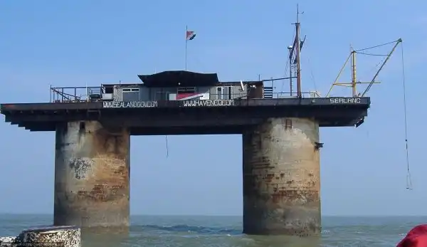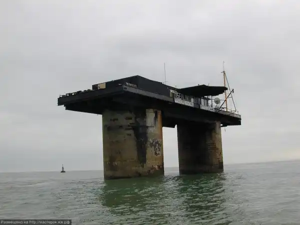 Вторая Мировая война кончилась победой союзников и линию обороны из морских платформ демонтировали, но «Форт Маунселл» остался на своем месте – с него сняли орудия и прочее армейское оборудование, но убрать его не имели права (остался еще Нок Джон Форт, он на изображении ниже). Дело в том, что по международному законодательству морская территория по периметру британских островов, находящаяся в собственности Великобритании, ограничена тремя морскими милями от береговой линии. Все прочие орудийно-зенитные платформы были выставлены в ее пределах, а вот «Форт Маунселл» установили дальше всех – в шести морских милях от берега, аккурат напротив устья реки Темза. Т.е. Англия не имела никакого права на нее и поэтому не могла демонтировать – платформа стала ничейной, расположенной в нейтральных водах.