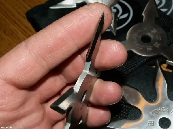 На Востоке идут другим путём, например, применяя ножи с ятаганной рукояткой, характерной особенностью которой является расширение задней части, так называемые «уши». Вот эти «уши» и играют роль стабилизатора при метании. Восток — дело тонкое. В справедливости этих слов убеждаешься, взглянув на метательный нож «сюрикен» (среди знатоков сей снаряд именуется по-разному, но здесь я предпочитаю пользоваться наиболее распространённым названием, под которым он известен широкой публике). Идея проста до гениальности: несколько лезвий, расположенных по кругу. При метании вероятность поражения цели одним из них приближается к 100 процентам. Для увеличения дальности броска «сюрикен» метают параллельно земле, закручивая, как пропеллер. Видов и типов метательных звёздочек существует великое множество, но есть у них одна общая черта — их боевые возможности сильно преувеличены. Виноват, как всегда, кинематограф, создавший целые сериалы, воспевающие восточные единоборства средневековых японских шпионов «ниндзя» и экзотические виды оружия, среди которых не малое место занимают и «сюрикены». Как правило, в кино одного «сюрикена», брошенного мастером, хватает для уничтожения противника. На практике всё гораздо скромнее. Виной всему — конструкция метательного ножа, не позволяющая нанести глубокую рану, поэтому летальный исход при использовании «сюрикена» может быть только при очень удачном попадании, например, в горло. В основном «сюрикены» служили для того, чтобы ошеломить противника или временно вывести его из строя, конечно, за исключением тех случаев, когда их клинки покрывались ядом.