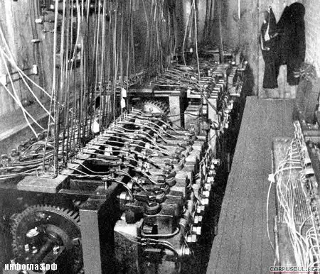 Каждая нажатая клавиша задействовала одновременно девять дополнительных переключателей, каждый из которых был соединён с различными тяговыми стержнями, расположенными над клавиатурой.