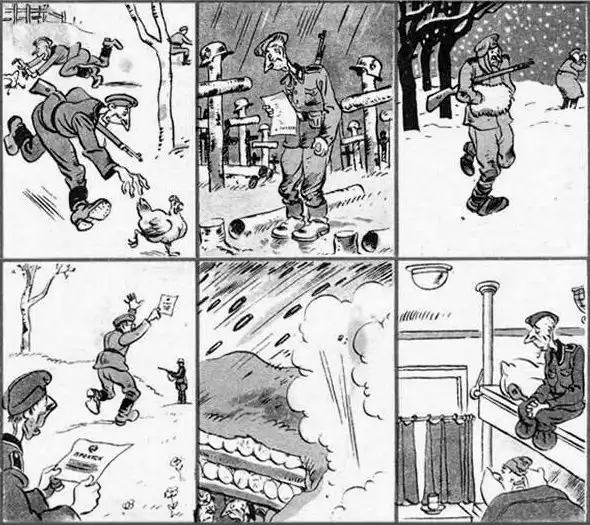 Законодателями мод были Борис Ефимов и коллектив художников, работавших под псевдонимом Кукрыниксы (Михаил Васильевич Куприянов, Порфирий Никитич Крылов и Николай Александрович Соколов). Помимо всемирно известных одиночных рисунков-карикатур, на страницах газет и в отдельных изданиях появлялись настоящие комиксы — серии рисунков со связанным сюжетом. Обычно это были истории о немцах, которые хотели поработить советский народ, но получили отпор. Художники работали так, чтобы даже без подписей и реплик нарисованная история становилось понятной самому неискушённому читателю.