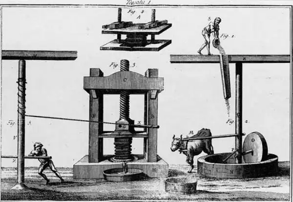 Сначала дожидались пока оливки полностью созреют: они сначала зеленые, потом красные и бурые, а потом черные. Черные оливки легко собирать — достаточно потрясти дерево и они упадут. Собранные оливки укладывают в темное место, где они еще с месяц дозревают-ферментируются. Потом оливки крошат — обычно тяжелым каменным диском, вращающимся по кругу. Измельченную массу перекладывают в мешок сделанный из мелкой сетки. Мешок кладут под пресс. Отжатой жидкости дают отстояться — сверху будет оливковое масло, а осадок можно использовать для разных косметических целей. На следующей картине 16-го века можно видеть все подробности — от левого нижнего угла и далее по часовой стрелке.