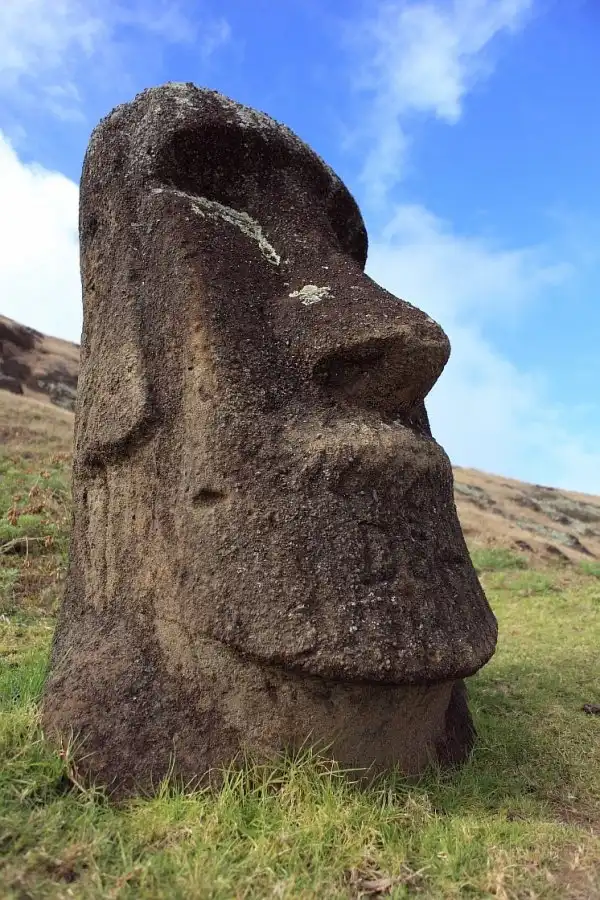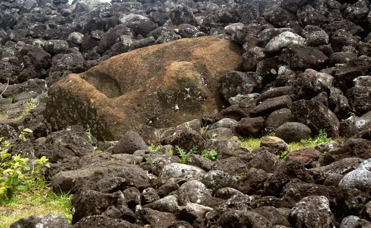 Подавляющее большинство статуй лежат незаконченные в каменоломнях или вдоль древних дорог. Некоторые из них застыли в глубине кратера вулкана Рано-Рараку, некоторые выходят за гребень вулкана и словно направляются к океану. Все как будто остановилось в один момент, охваченное вихрем неизвестного катаклизма. Почему скульпторы внезапно прекратили свою работу? Все оставлено на месте — и каменные топоры, и незаконченные статуи, и каменные гиганты, словно застывшие на пути в своем движении, как будто люди просто на минуту оставили свою работу да так и не смогли вернуться к ней.
