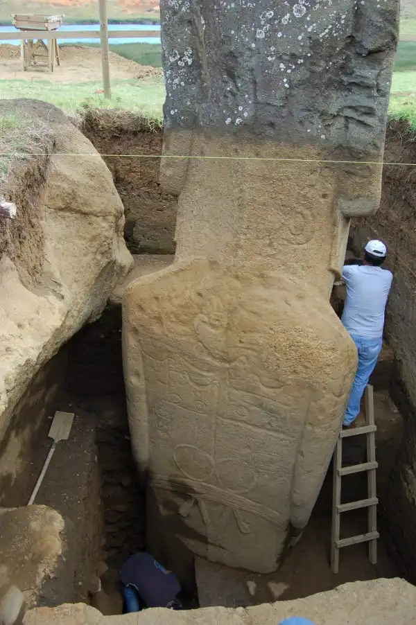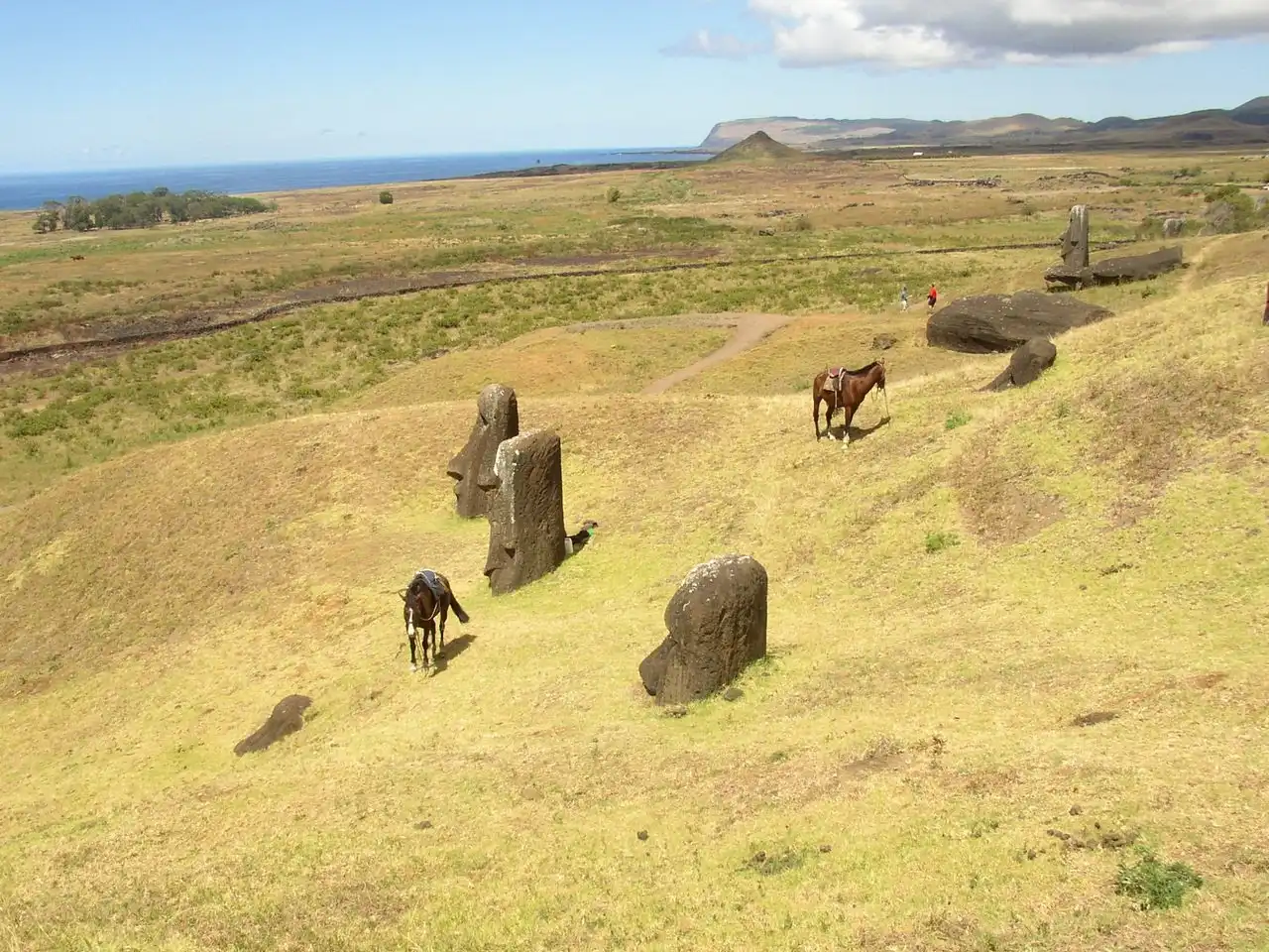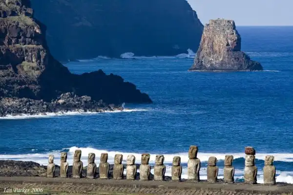 Совершенно необъяснимыми казались около 200 гигантских каменных изваяний — «Моаи», расположенные на массивных постаментах вдоль побережья острова с жалкой растительностью, вдали от каменоломен. Большинство статуй располагались на массивных постаментах. Еще не менее 700 скульптур, в разной степени готовности, были оставлены в карьерах или на древних дорогах, связывающих карьеры с побережьем. Складывалось впечатление, что скульпторы внезапно оставили свои инструменты и прекратили работу..