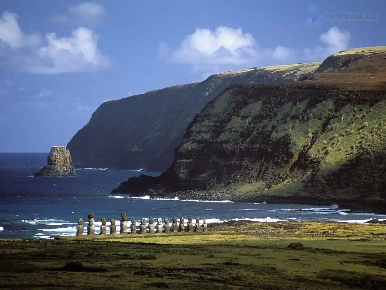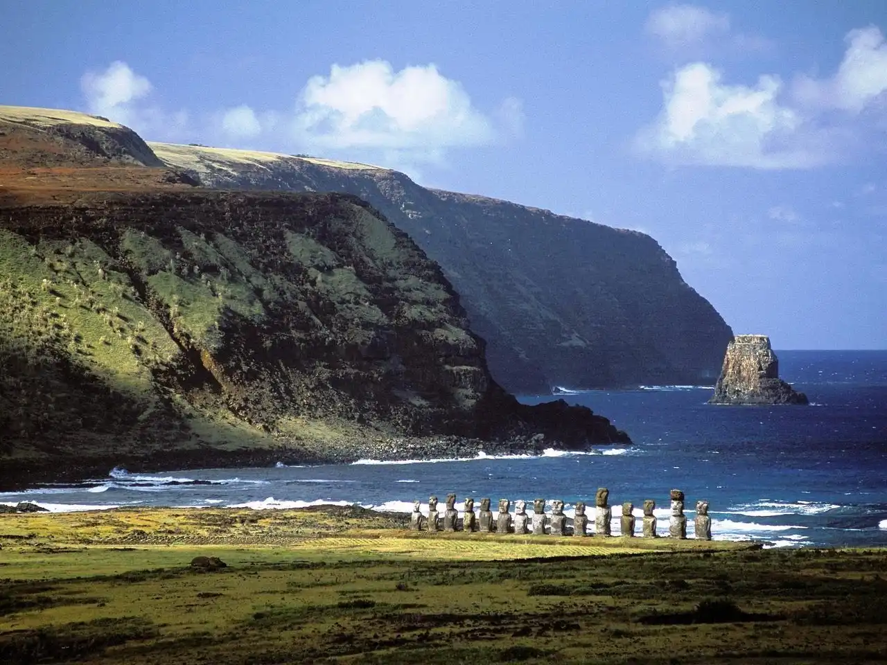 Остров Пасхи полон загадок. Повсюду на острове можно увидеть входы в пещеры, каменные площадки, желобчатые аллеи, ведущие прямо в океан, огромные статуи, знаки на камнях.