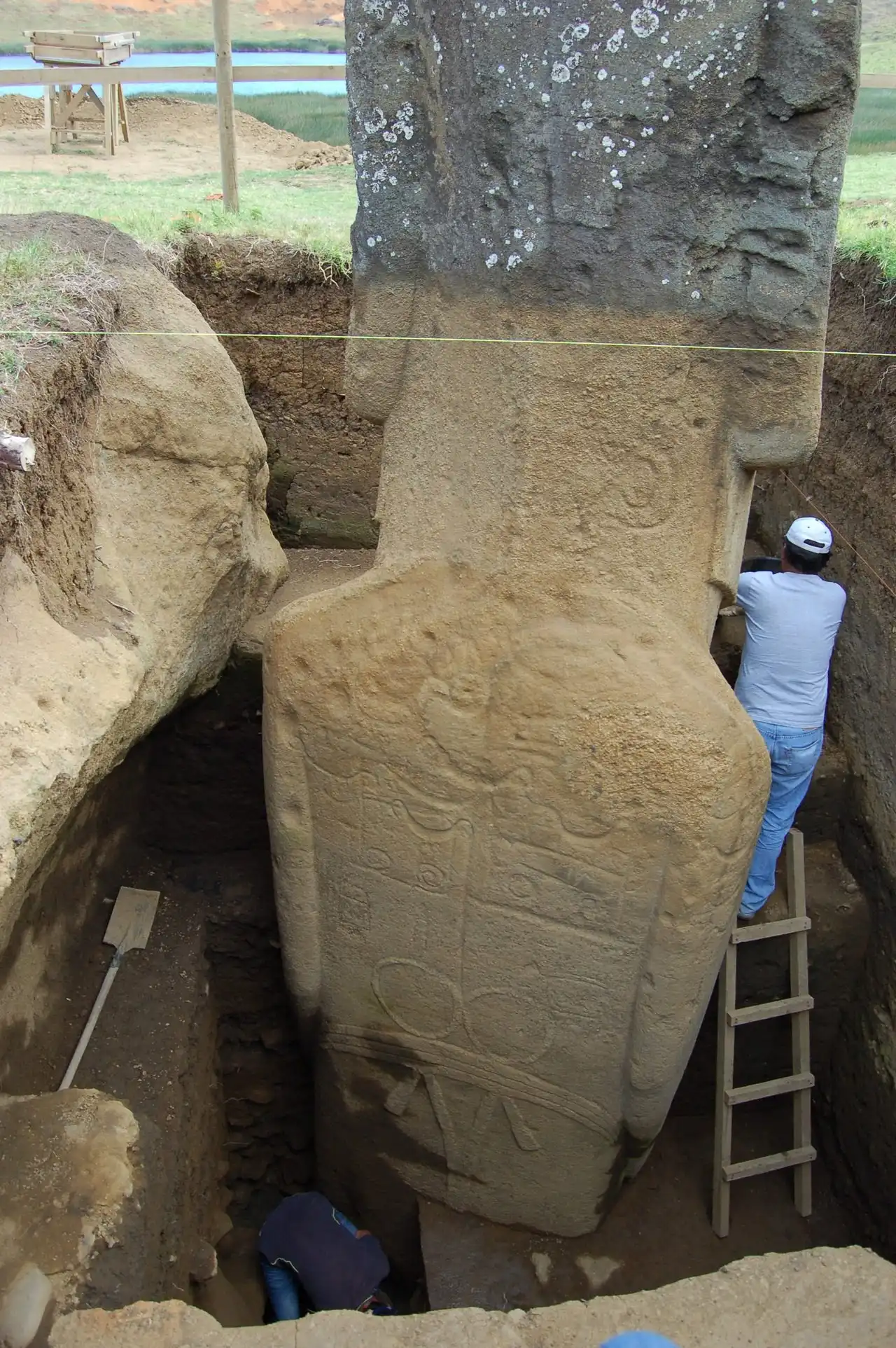Раскопки, проведенные на нескольких участках древних дорог, по которым, предположительно, островитяне переносили многотонные статуи (иногда на расстояние более 20 километров), показали, что все дороги явно обходят плоские участки. Сами дороги представляют собой ложбины V или U-образной формы шириной около 3,5 метров. На некоторых участках присутствуют длинные соединительные фрагменты, по форме напоминающие бордюрный камень. В некоторых местах отчетливо видны столбы, вкопанные за пределами бордюров, — возможно, они служили опорой некому приспособлению вроде рычага. Точной даты строительства этих дорог ученые пока не установили, однако по предположениям исследователей процесс перемещения статуй был закончен на острове Пасхи примерно к 1500 году до н.э.