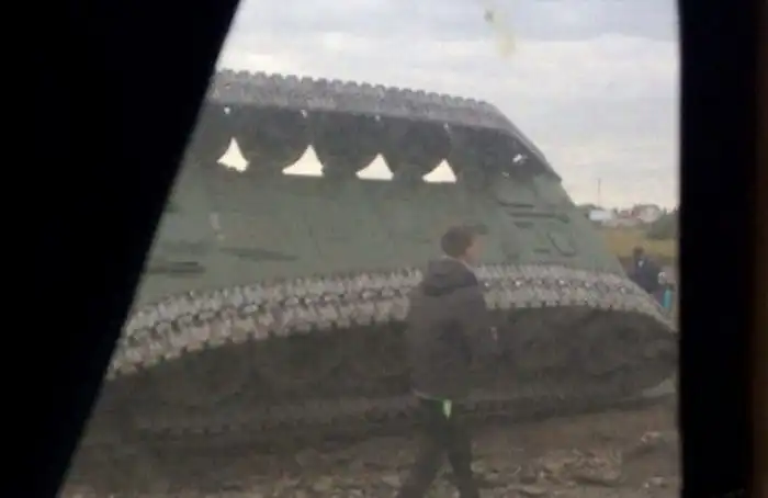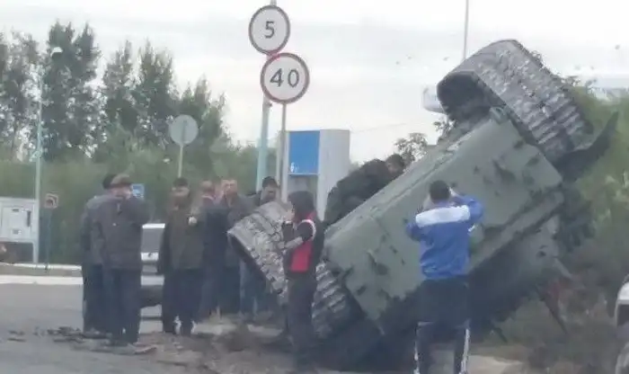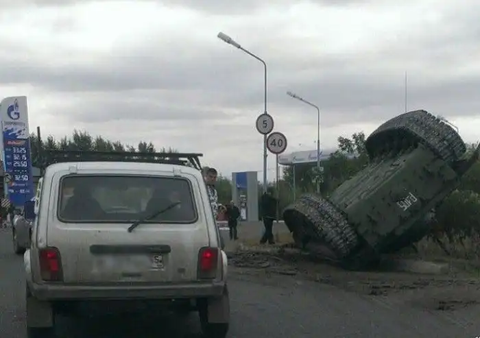 Судя по видеоролику, танк упал на бок с платформы тягача во время его транспортировки. Как оказалось, боевой танк как раз перевозили в танковую часть, которая расположена неподалеку от места происшествия. Думаю, начальство точно будет не в восторге от данного ДТП ))