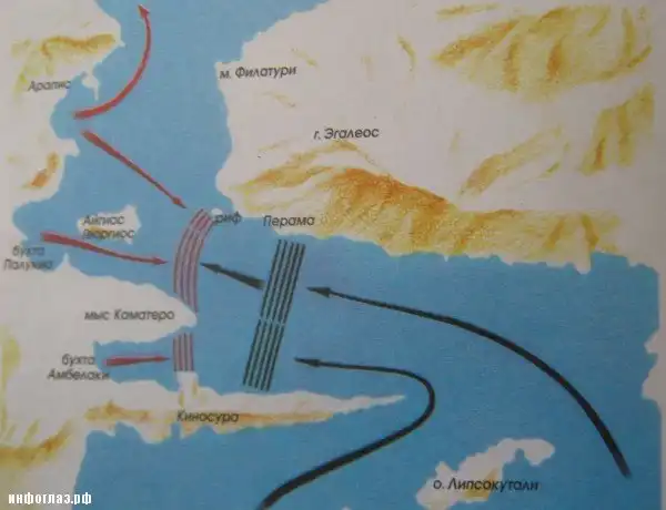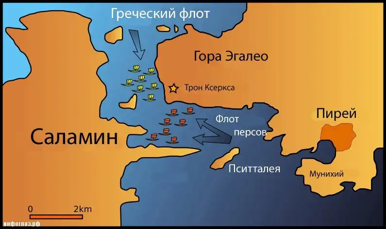 Воспитатель его детей, раб по имени Сикинн (что любопытно — персидского происхождения) отправился к Ксерксу и пообещал, что в бою отряд Фемистокла перейдет на сторону персов. «В доказательство своей преданности Фемистокл сообщает царю о планах греков. Царю следует запереть оба выхода из Саламинского пролива и не дать грекам уйти», — сообщил раб. Ксеркс поверил этим словам. И персидские корабли полезли в ловушку Фемистокла, запирая выходы из пролива, в том числе самый узкий и неудобный для больших судов — у мыса Каматеро. Именно там развернулись основные события.