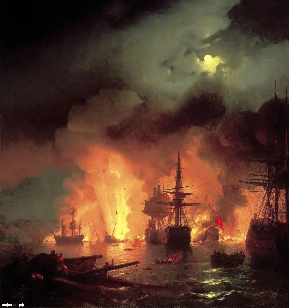 Любопытный факт. К совершенно противоположным результатам, при очень похожих «исходных данных», привело сражение русского и турецкого флотов при Чесме (июль 1770 года). Вместо того, чтобы атаковать турецкие суда, которые укрылись в Чесменской бухте, русский адмирал Григорий Спиридов под прикрытием ночи пустил на них четыре брандера — небольших судёнышка, нагруженных горючими веществами и поджигающих корабли противника. До цели дошел только один брандер, но этого оказалось достаточно: к утру весь турецкий флот, за исключением шести кораблей, был уничтожен пожаром.