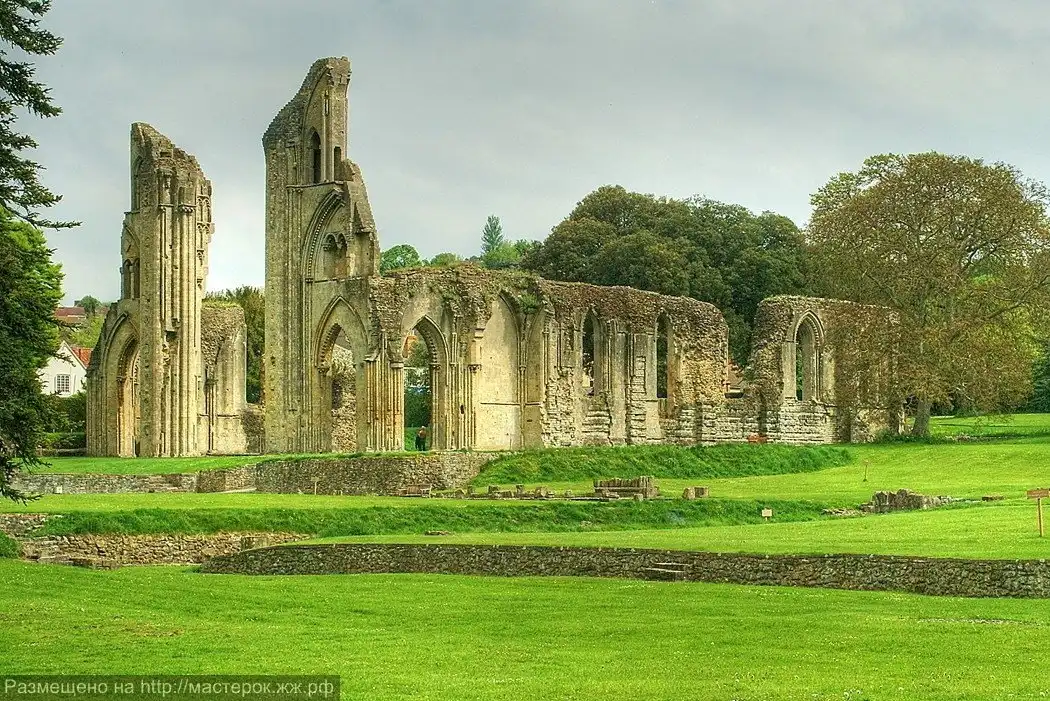 Само же аббатство было заложено невдалеке от холма саксонским королем Айне в 705 году, а с Х века оно стало не только крупнейшим бенедиктинским монастырем в Англии и святым местом, но и излюбленным центром паломничества. Но уже в XVI веке, в правление Генриха VIII, большинство церковных построек было разрушено из-за расхождения во мнениях в вопросах веры между монахами аббатства и католической церковью. Некогда могучие стены, остатки которых мы видим сегодня, превратились в развалины, и от былого великолепия не осталось и следа...