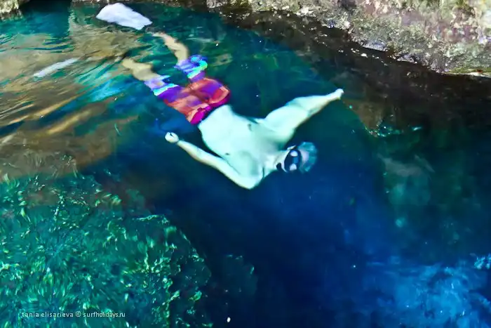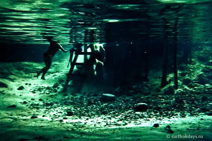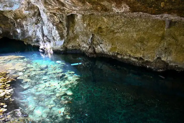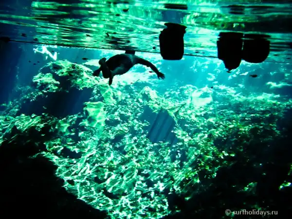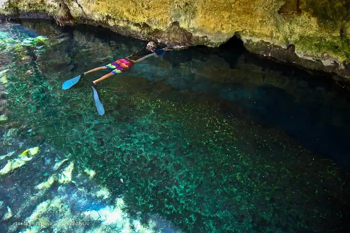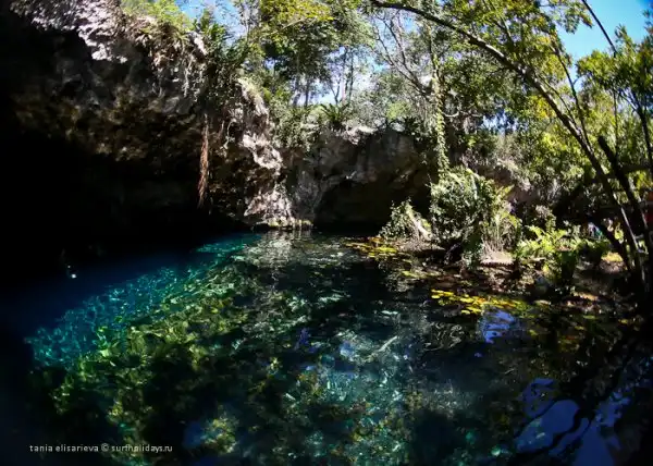 Вода в этом сеноте является кристально чистой бирюзового цвета с очень приятной температурой 25,5 ° С.