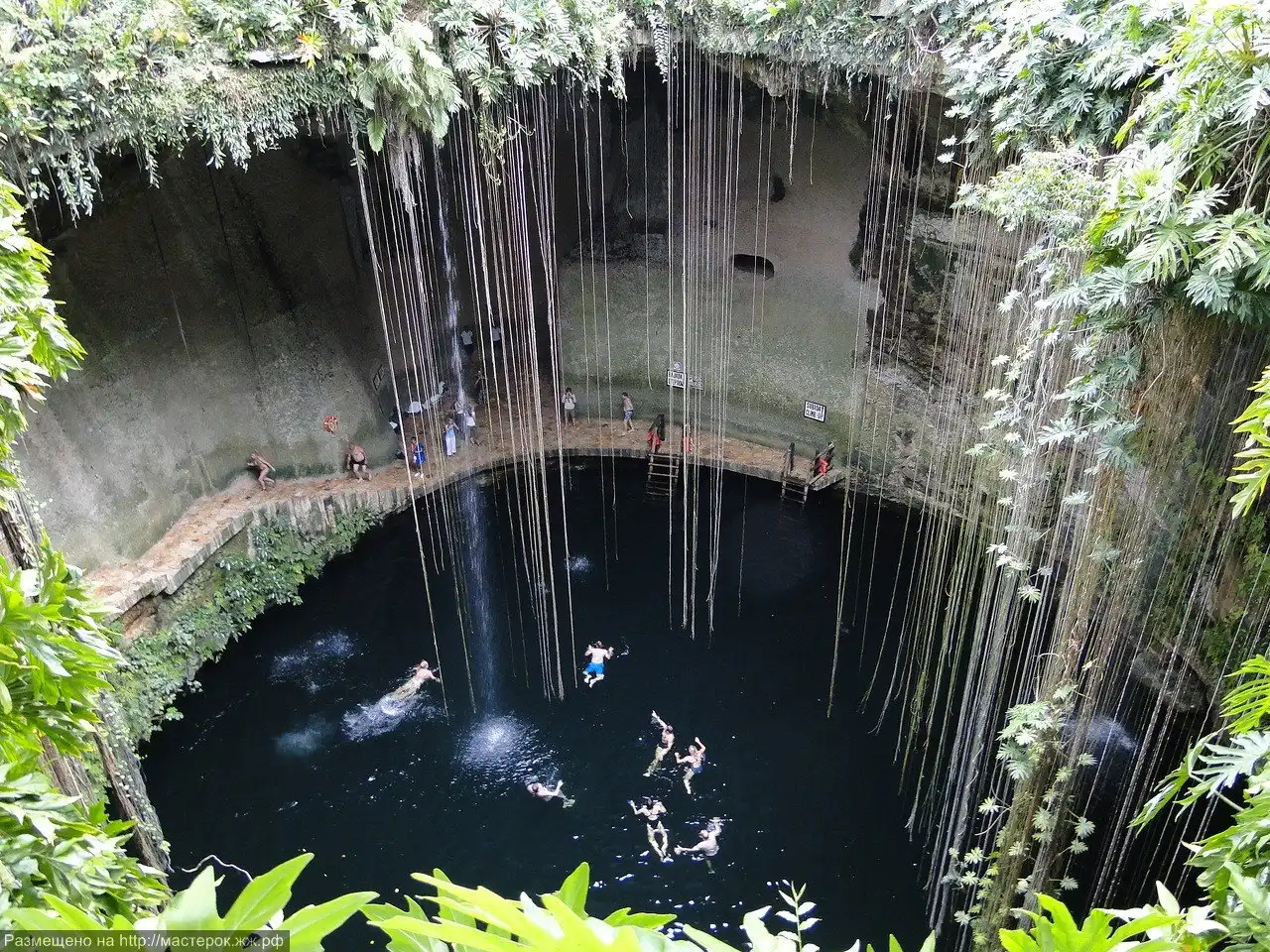 Это вид из прорубленного в стене окна. Сталактиты, что нависают над людьми - тоже искусственные. В некоторых сеноте на полуострове есть натуральные сталактиты, но в Ик Киль они ненатуральные.