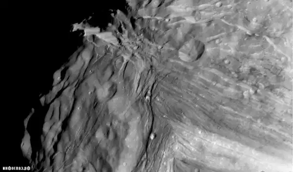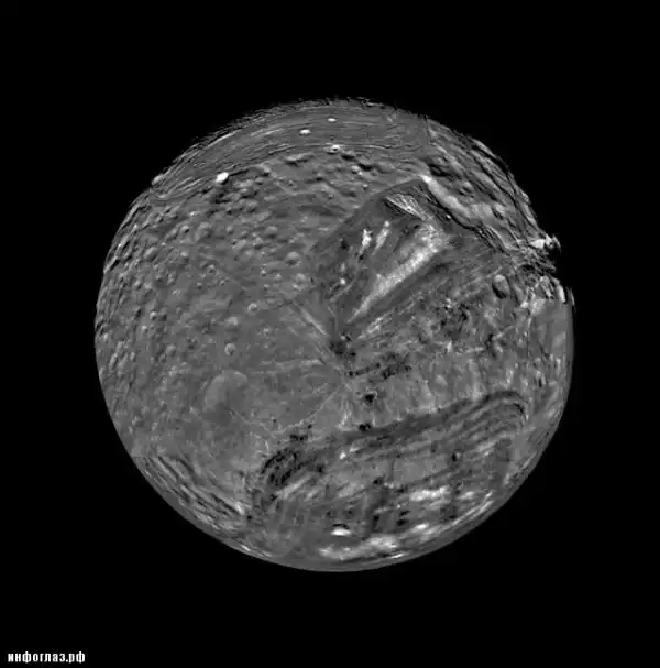 Миранда отличается от любого другого тела в Солнечной системе. Ее поверхность весьма необычна. Миранда , как полагают, состоит наполовину из водяного льда и наполовину из скального материала . Температура этого ледяного мира в среднем -335 F ( -187 ° C). Астрономы ожидали увидеть отсутствие какой либо геологической активности на поверхности, также как на Каллисто.
