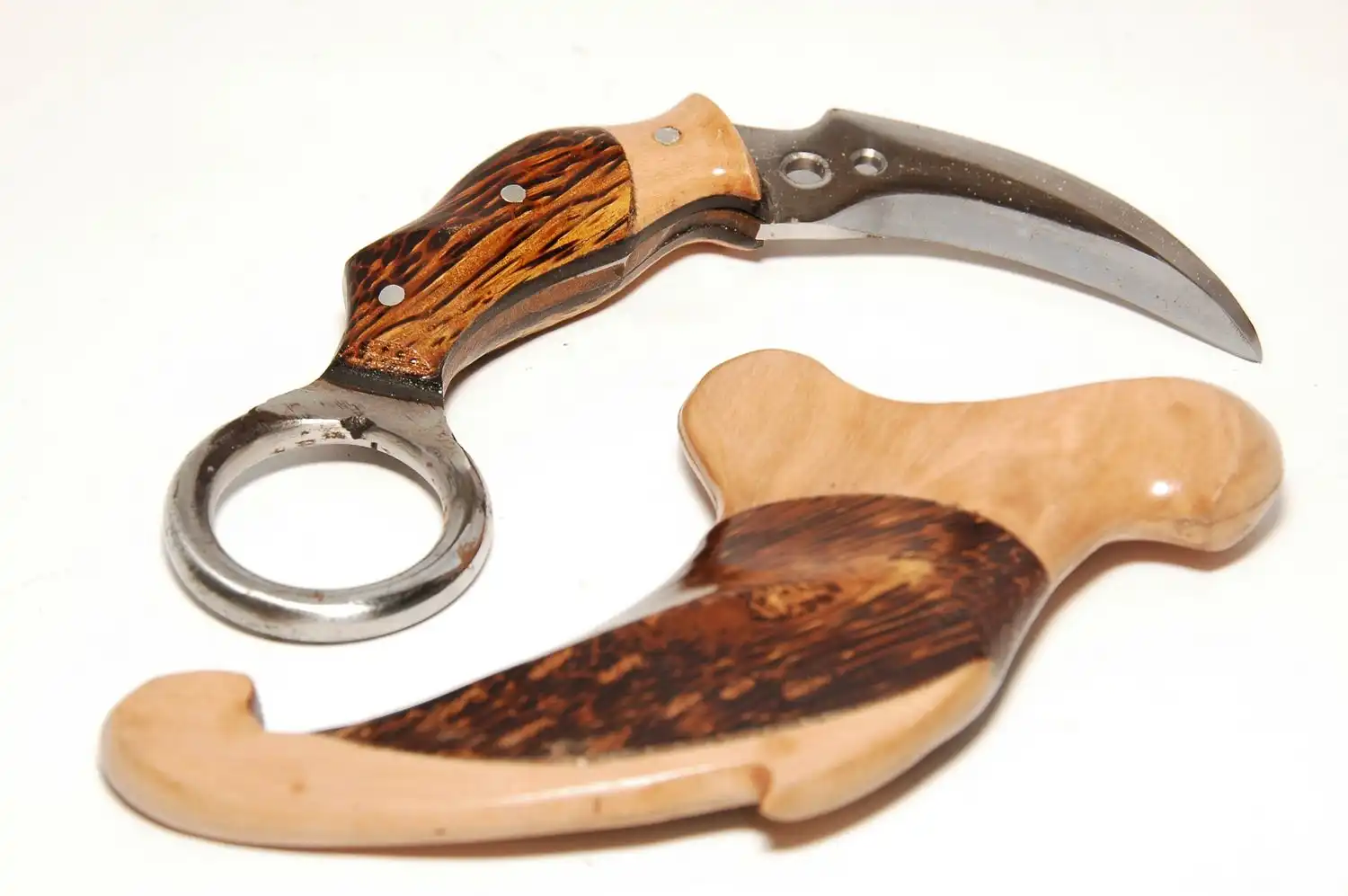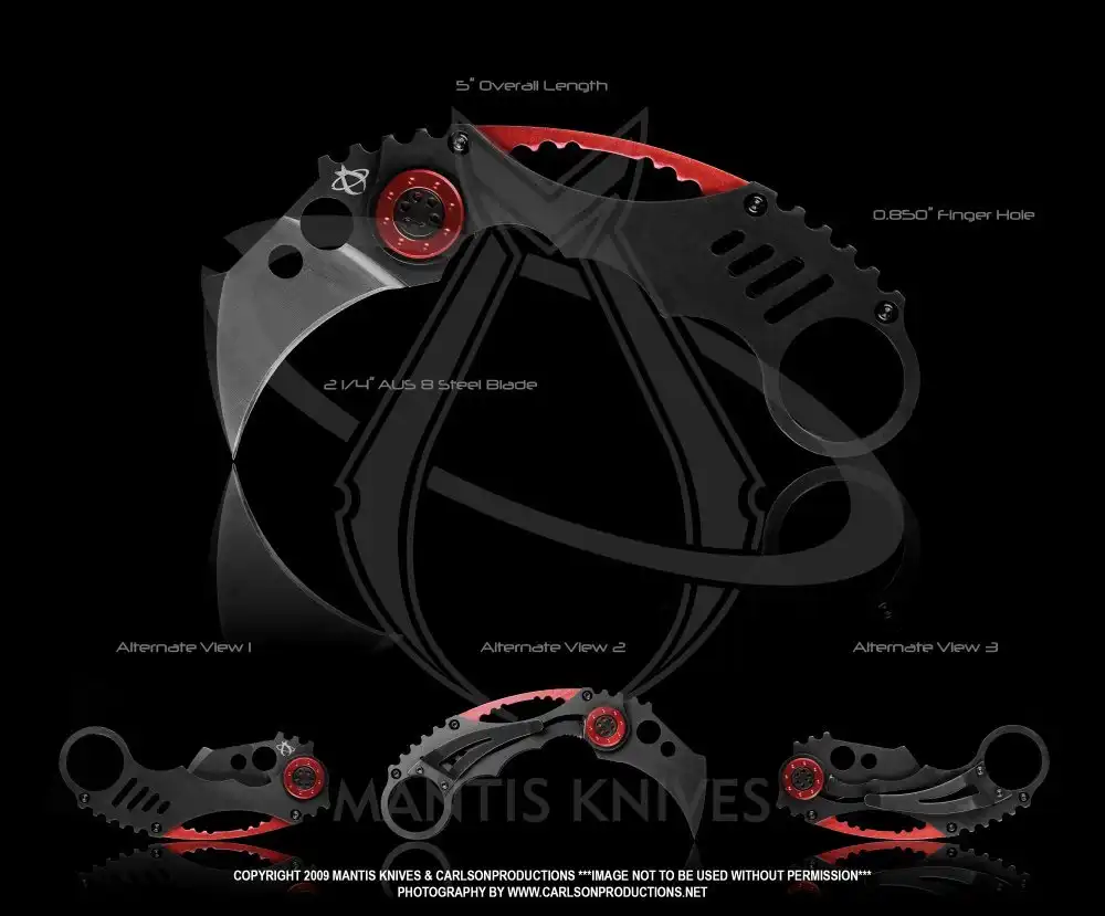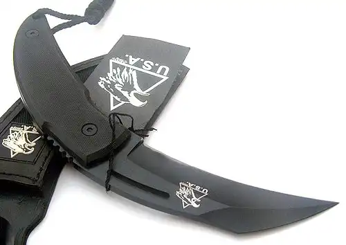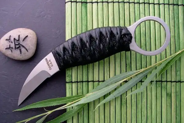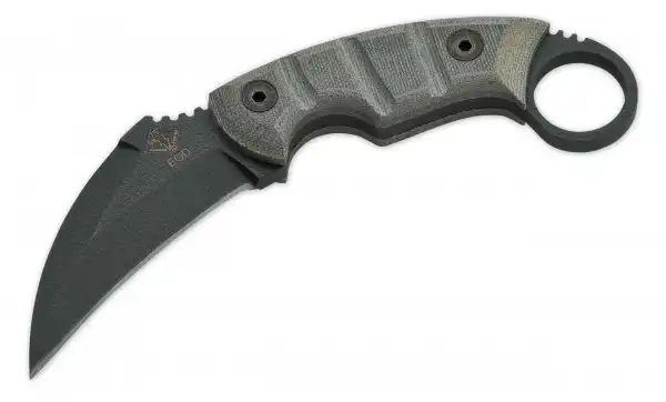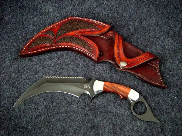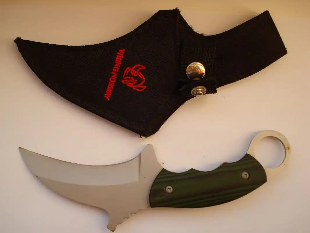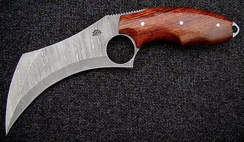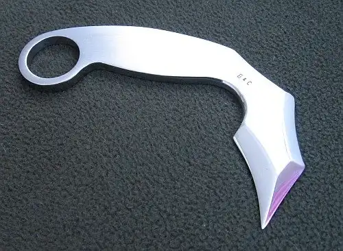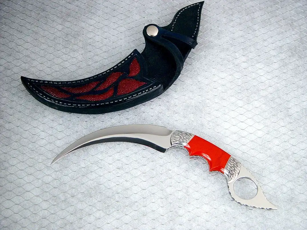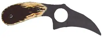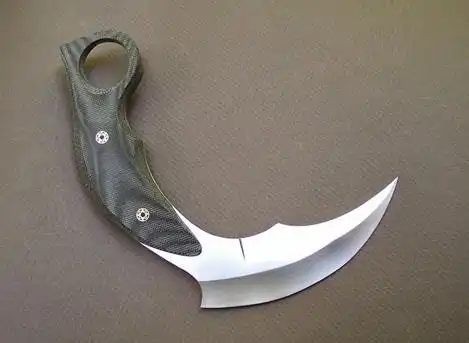 Классический керамбит - это нескладной нож с серповидным клинком, заточенным по вогнутой стороне, предназначенный, прежде всего, для работы обратным хватом острием от себя и имеющий рукоять с навершением в виде кольца под палец.