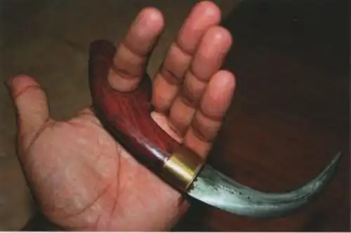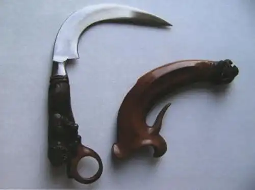 Одновременно множились различные названия этого оружия и мифы о его создании. Куку харимау (коготь тигра), куку Бима (коготь Бимы, одного из героев индийского эпоса Махабхарата), куку Хануман (коготь Ханумана, царя обезьян из индийского эпоса Рамаяна), куку гаруда (коготь орла), лави аям (петушиная шпора), булуаям (перо из петушиного хвоста) – вот далеко не полный перечень имен, под которыми известен керамбит и его варианты в разных районах архипелага. По мере распространения керамбита арсенал приемов работы с ним расширился за счет включения в него ударов, наносимых кольцом на рукояти или обухом клинка, различных вариантов хвата (в том числе и прямого), а также методов атаки, при которых керамбит прокручивался вокруг продетого в кольцо пальца.