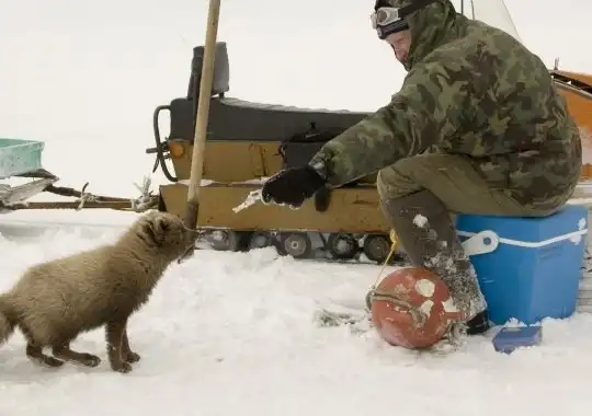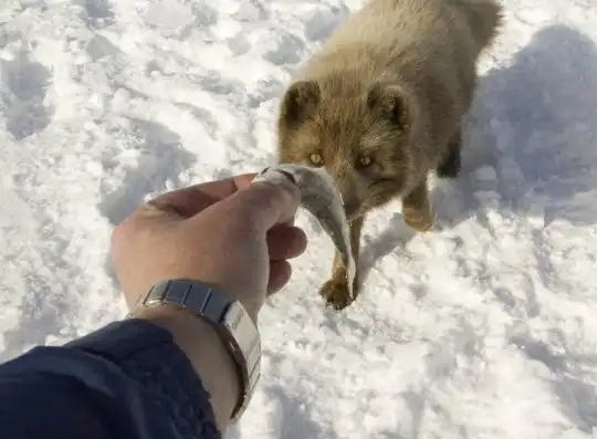 Песцы иногда появляются у посёлка, а «в острове» (местное выражение) могут бежать рядом с громыхающим ГТС или автомобилем, ну это в основном молодые или без страха, только приподняв голову, провожать взглядом, даже не поднявшись с лёжки в нескольких метрах от проезжающего транспорта. На кордонах или зимовьях живут под избушками иногда весь сезон рядом с инспекторами или научниками, кормясь остатками с кухонного стола.