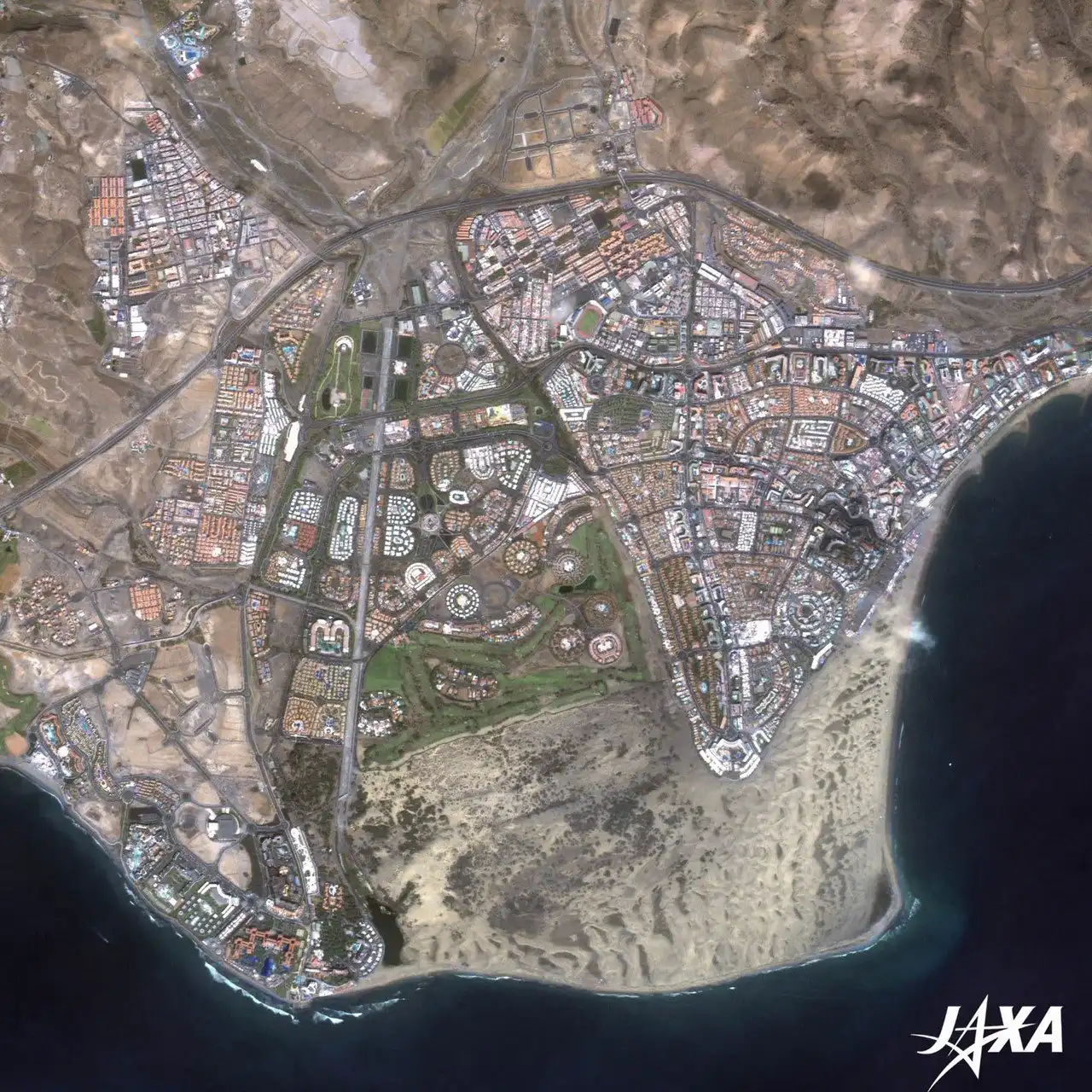 Сам же город дислоцируется в южной части острова Гран-Канария, Канарские острова. Дюны Маспаломас возникли в результате измельчения кораллов в песок, под воздействием ледникового периода. Сейчас, дюны движутся от двух до пяти метров в год. С 1987-го года, Маспаломас был присвоен статус природного заповедника. В глубине острова с дюнами граничит еще один природный заповедник – Ла Чарка. Это уникальное озеро, которое под давлением дюн регулярно меняет свою береговую линию. Озеро является важным перевалочным пунктом для мигрирующих птиц.