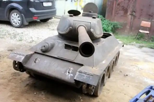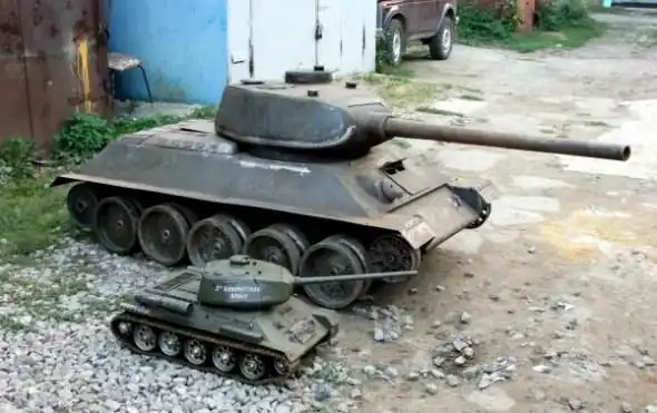 Его второй танк Т-34-85 создан в пропорции 1:8. Весит 47 кг, в качестве двигателя у него два электромотора дворников от старых "Жигулей". Машина получилась на удивление подвижной и мощной.